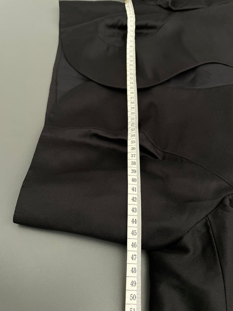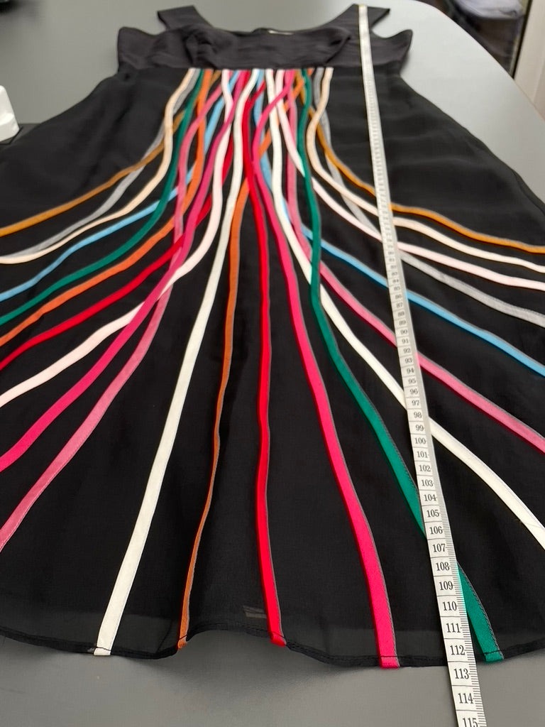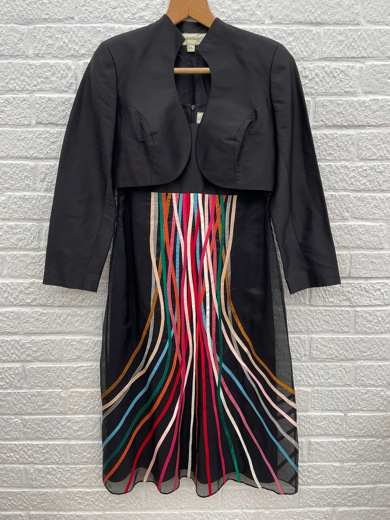 - Black silk top section with a sheer black silk skirt section decorated with a colourful and stunning ribbon effect design down the front