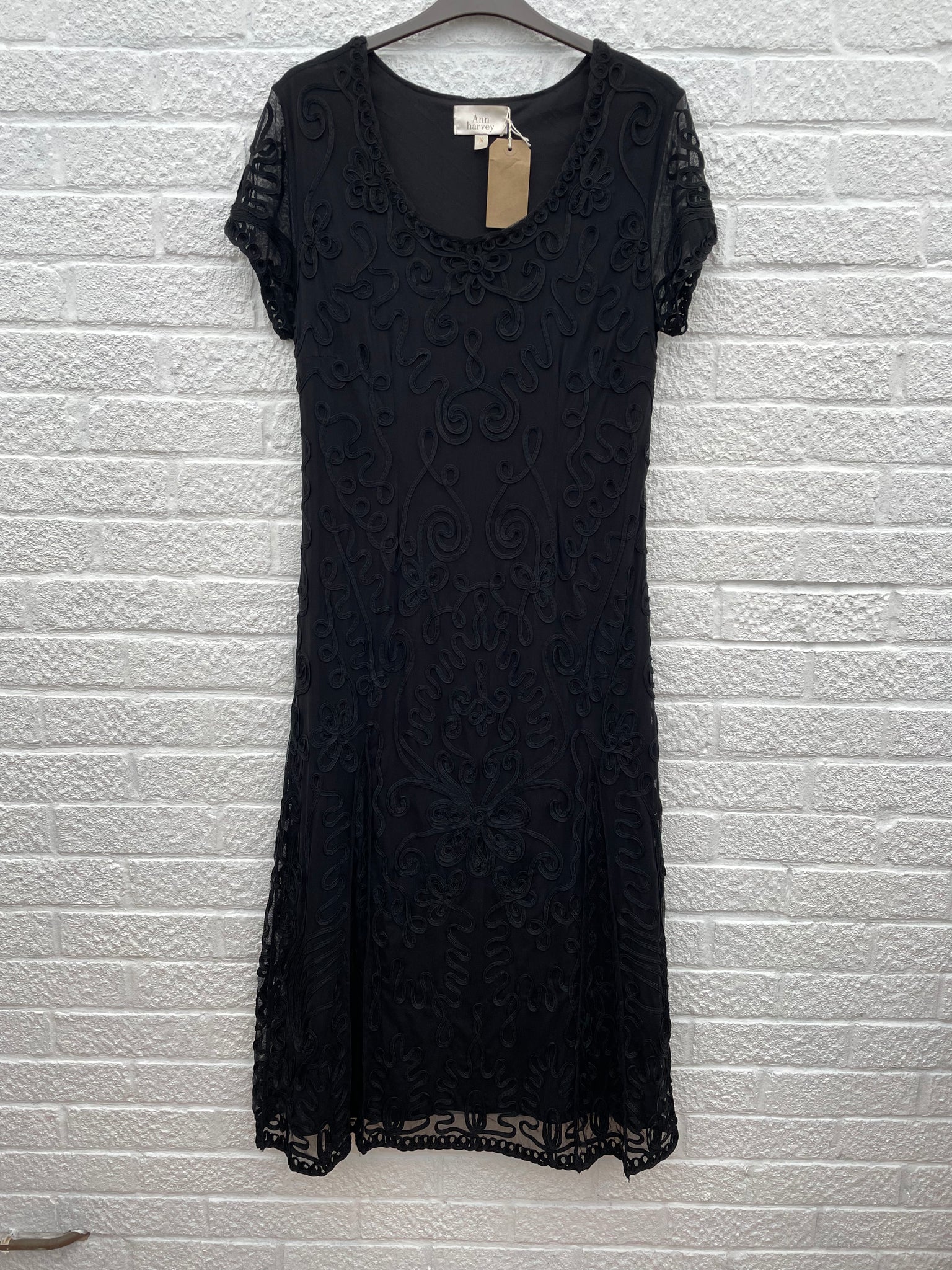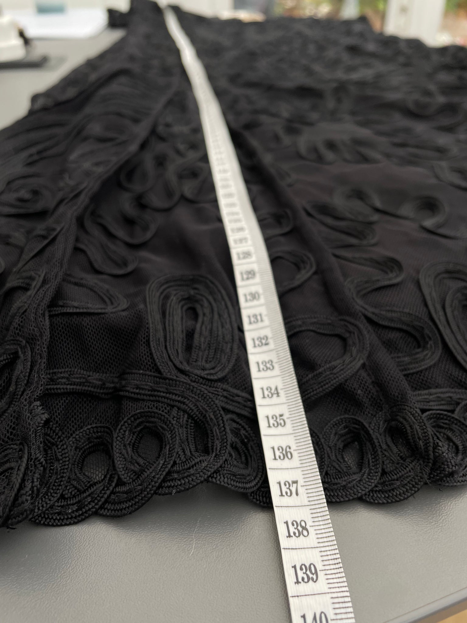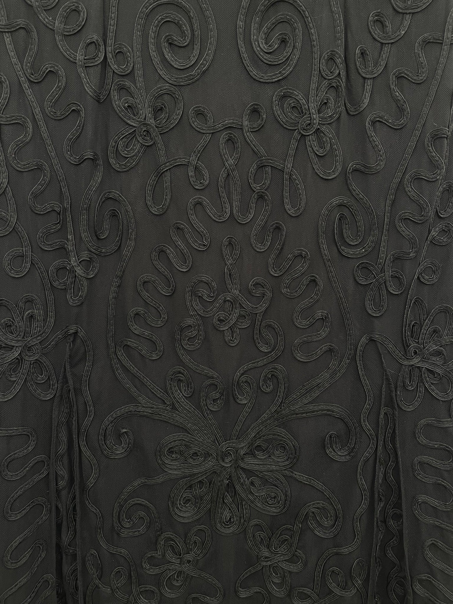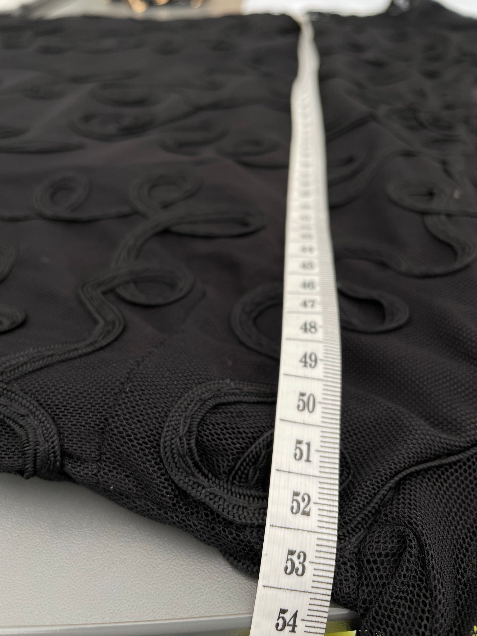 Black mesh fabric with a textured floral 'ribbon' design all over