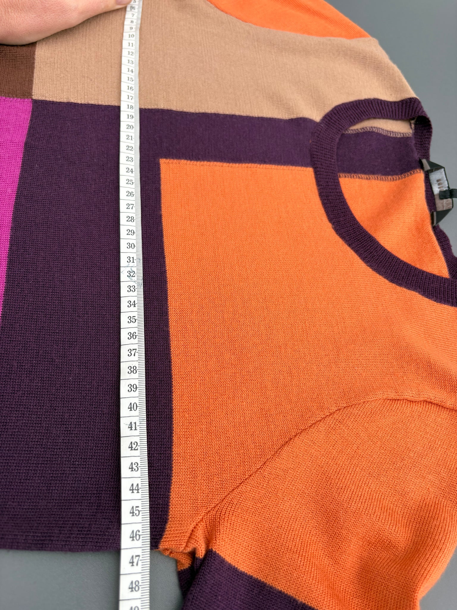 Patchwork knit fabric in purples, pink and oranges