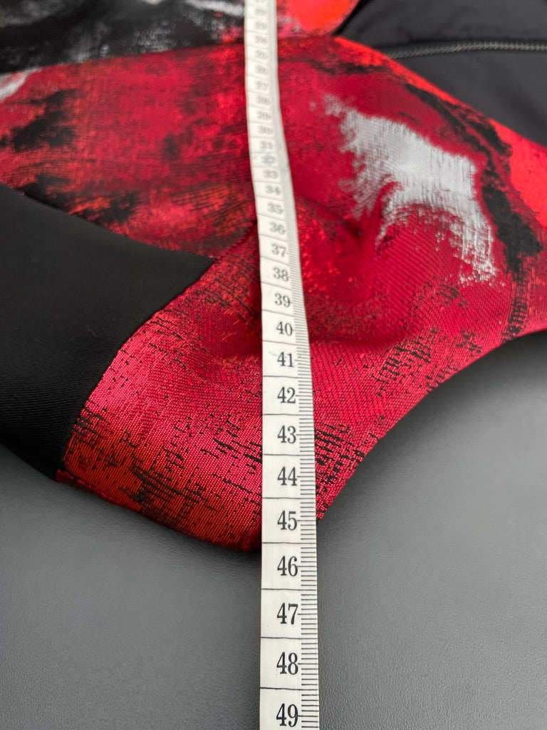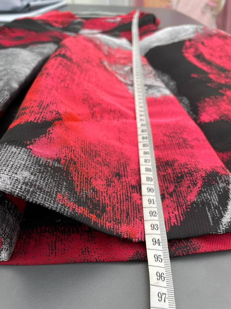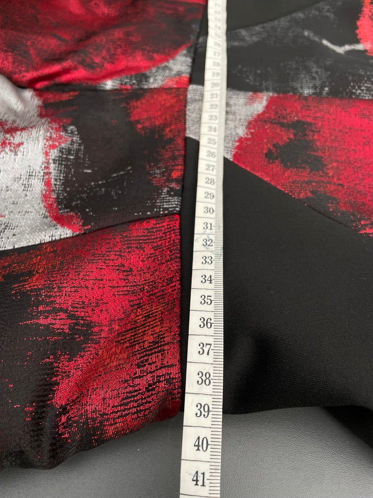 - A large abstract print all over in red, black and silver