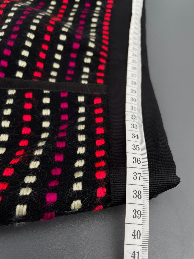 - Black fabric with a woven design in red, cream and pink