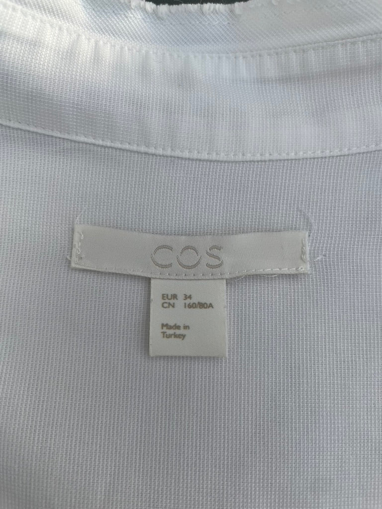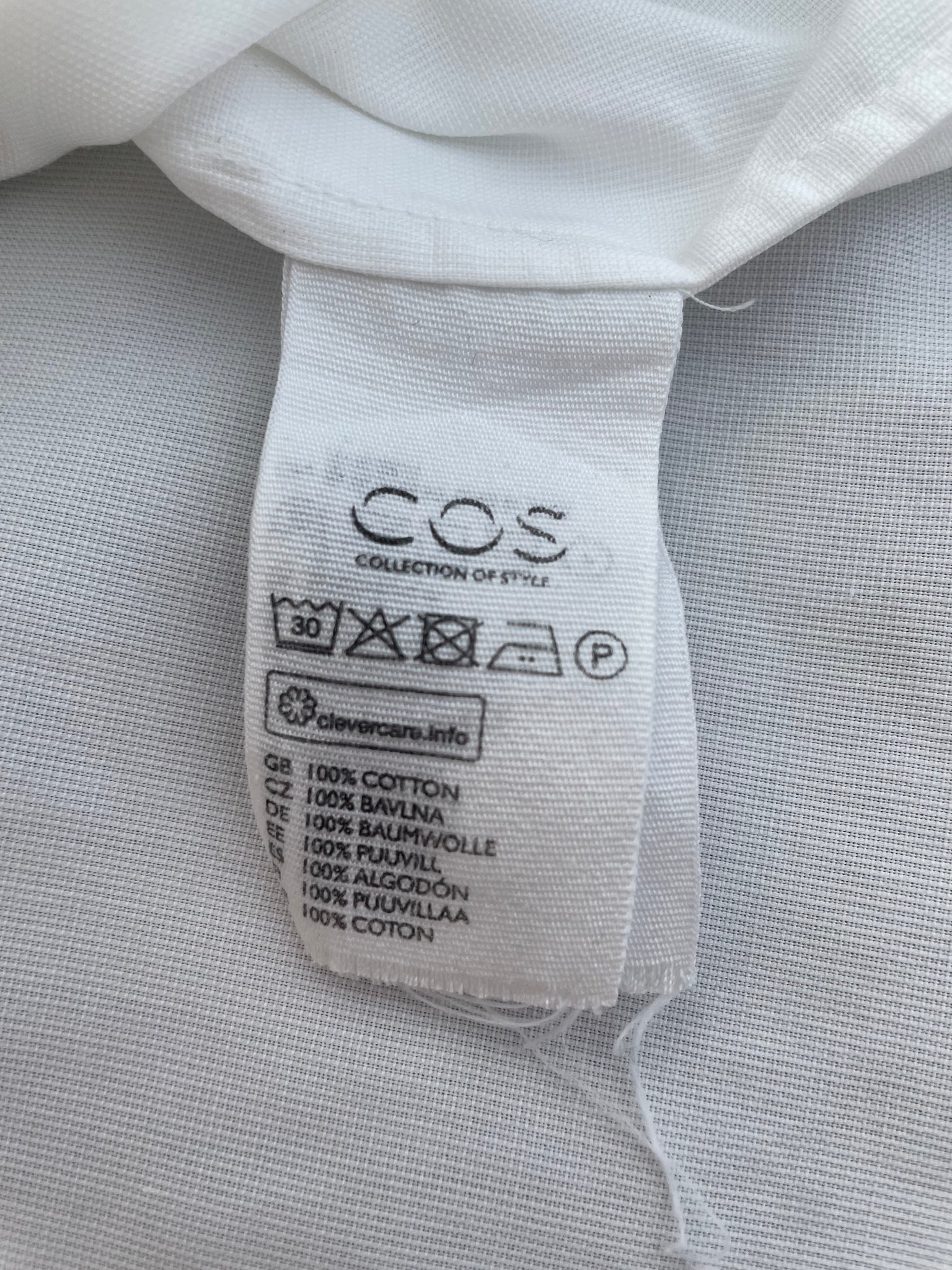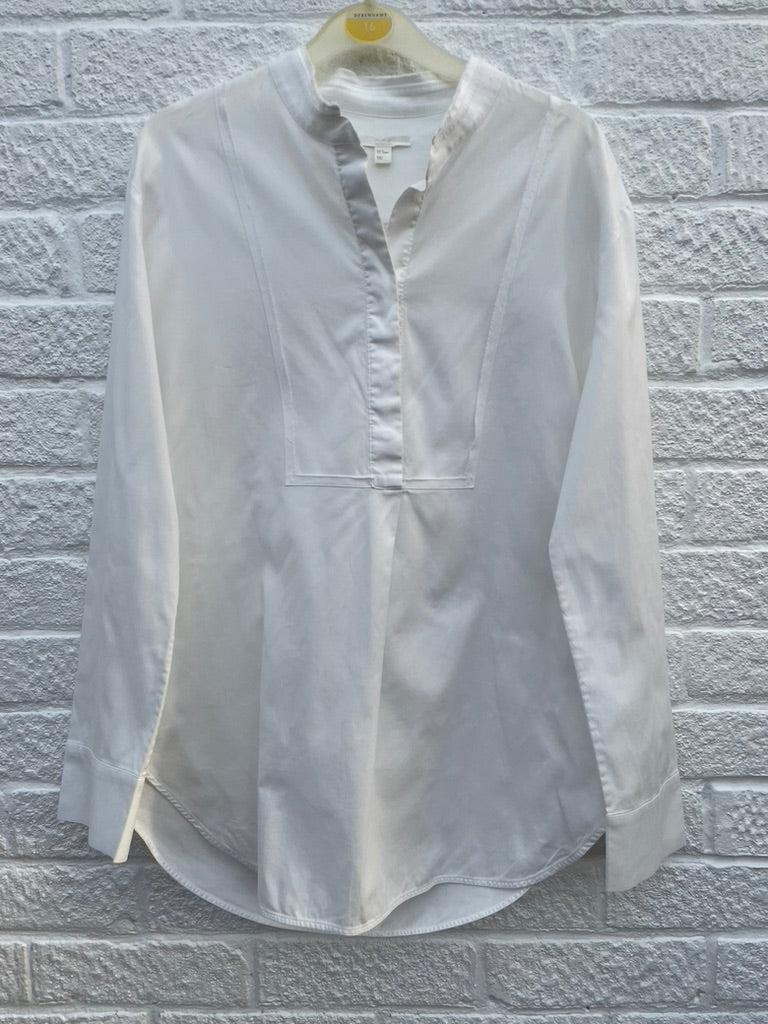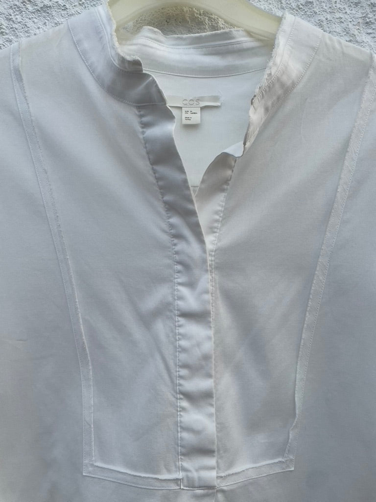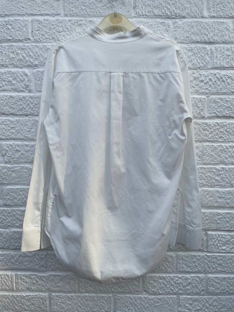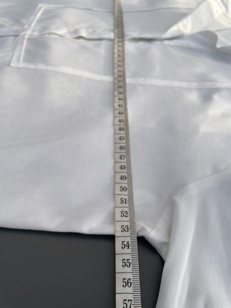 White cotton fabric in a faux tuxedo shirt style with a button up panel at the front