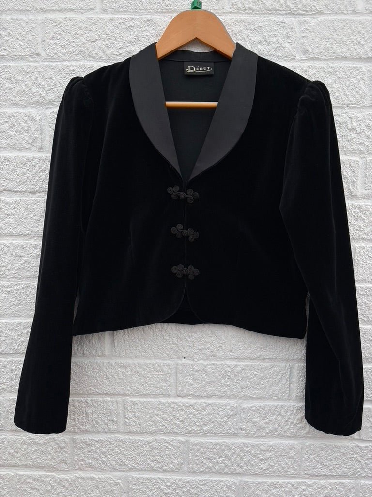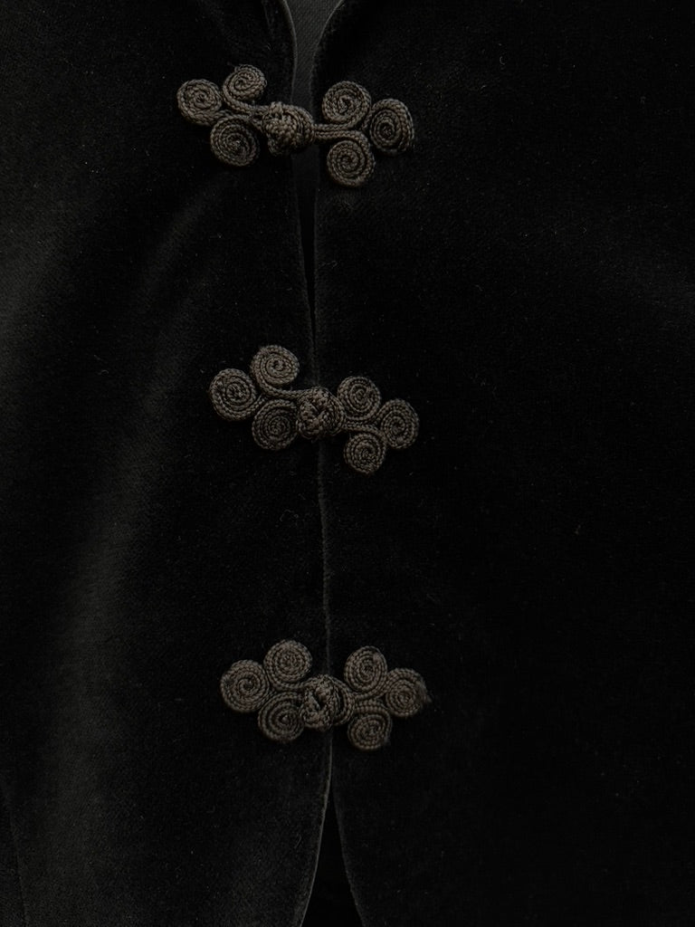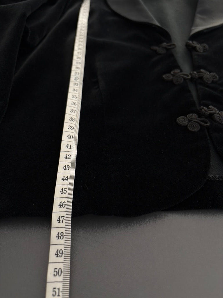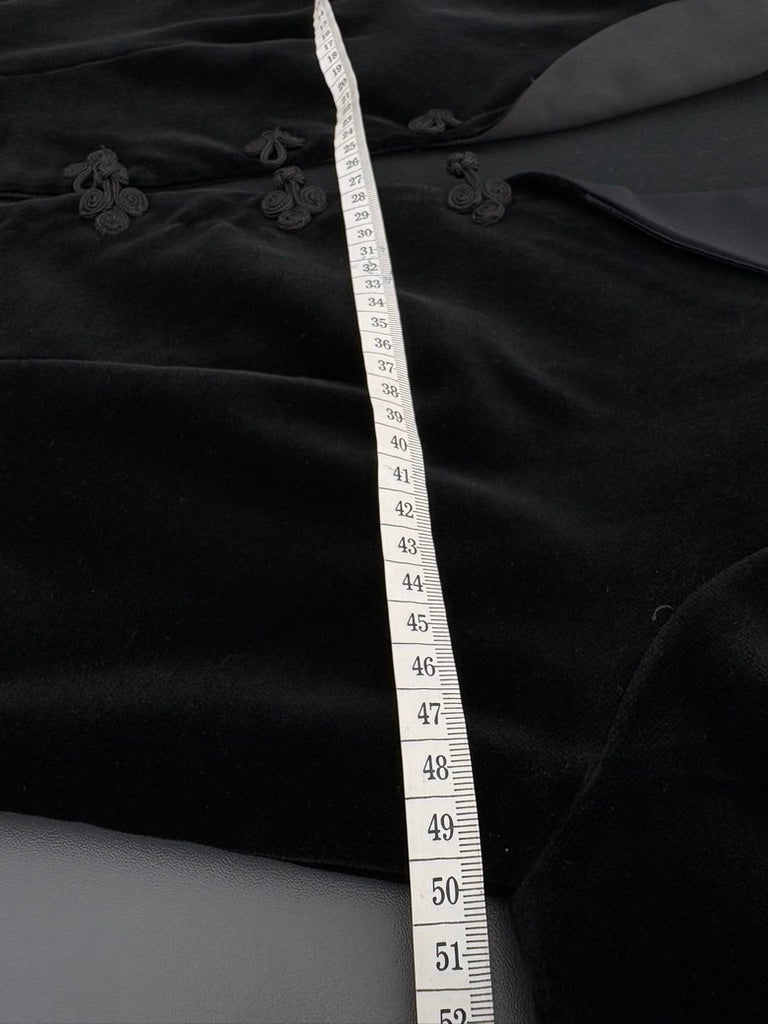 - Black velvet fabric with a contrast satin style collar