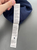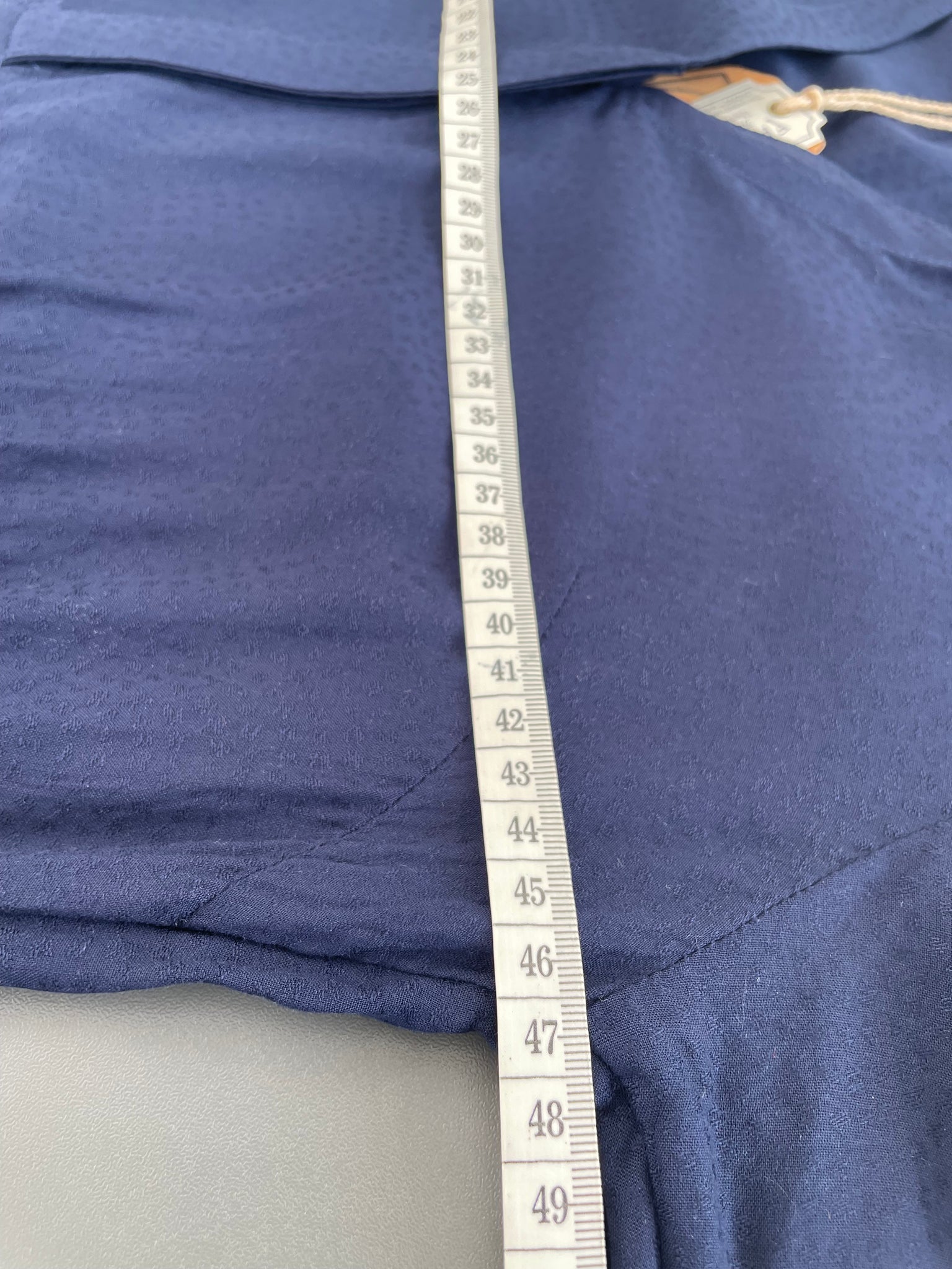 - Deep navy fabric with a subtle dotty texture