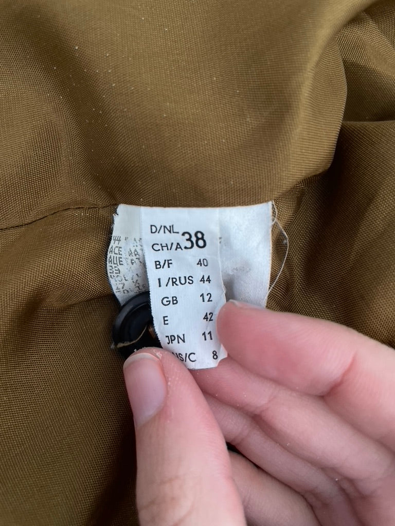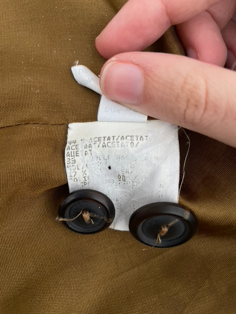 - Fitted shape with broad shoulders, and button fastenings at the front and buttons on the cuffs