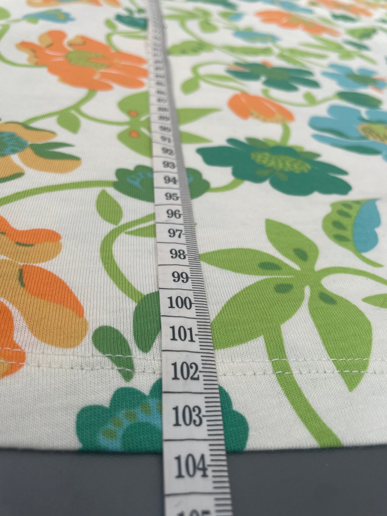 - Cream stretch jersey fabric with bright floral print in green, blue and orange