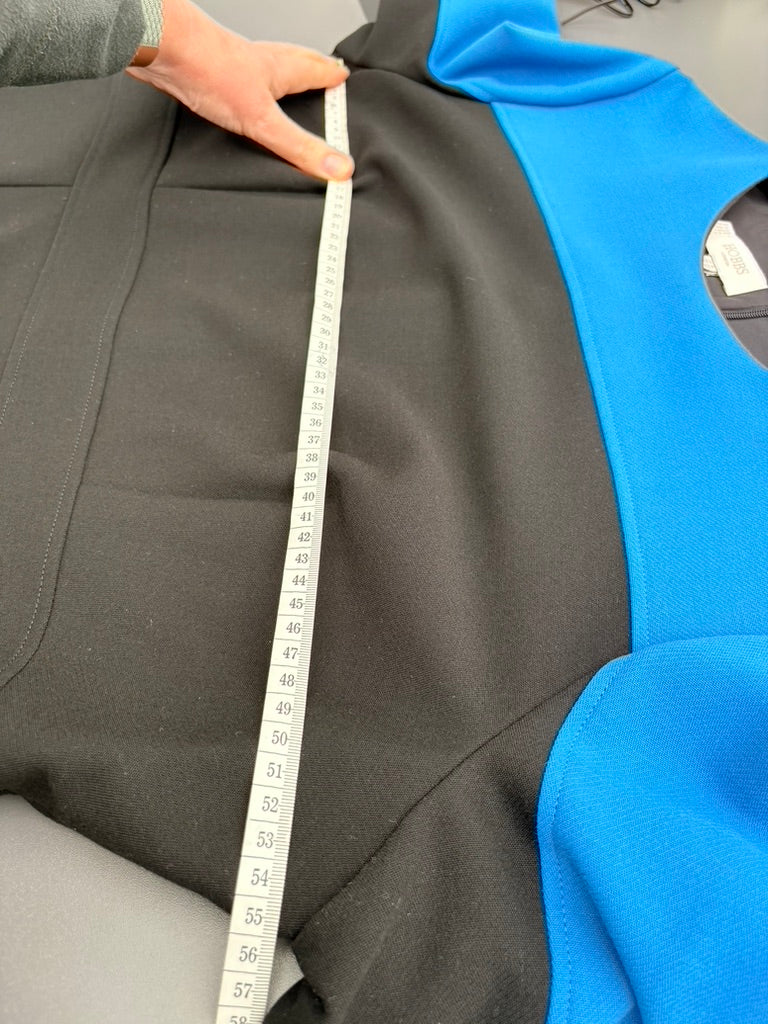 Panelled slight stretch fabric in black with a bright blue panel around the neckline