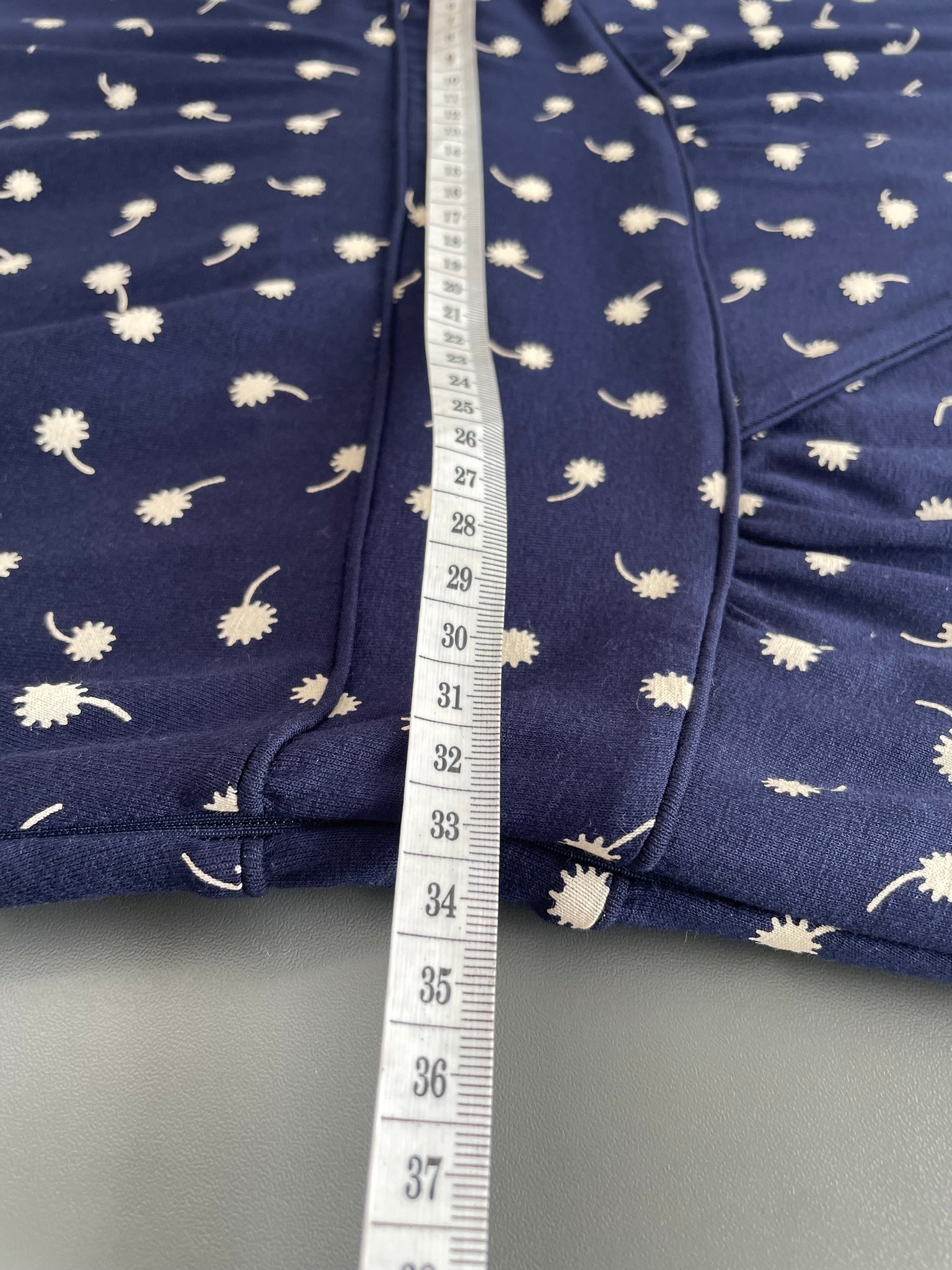 - Navy stretch fabric with small white flowers all over its