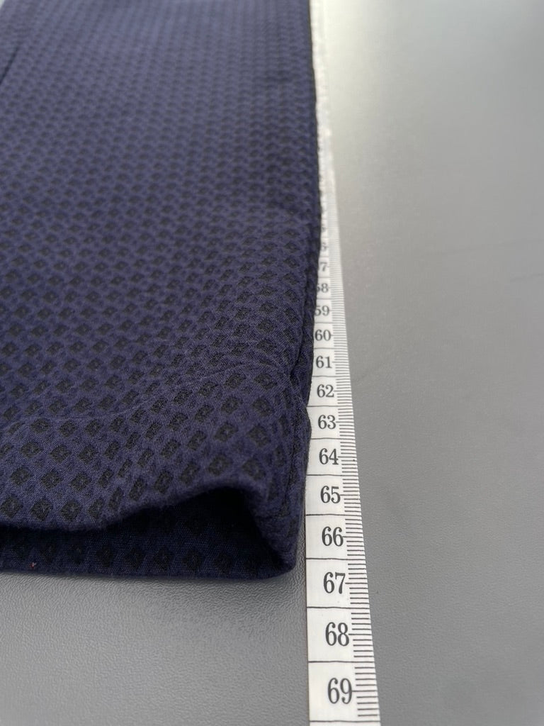 - Textured woven stretch fabric in a blue/ black weave