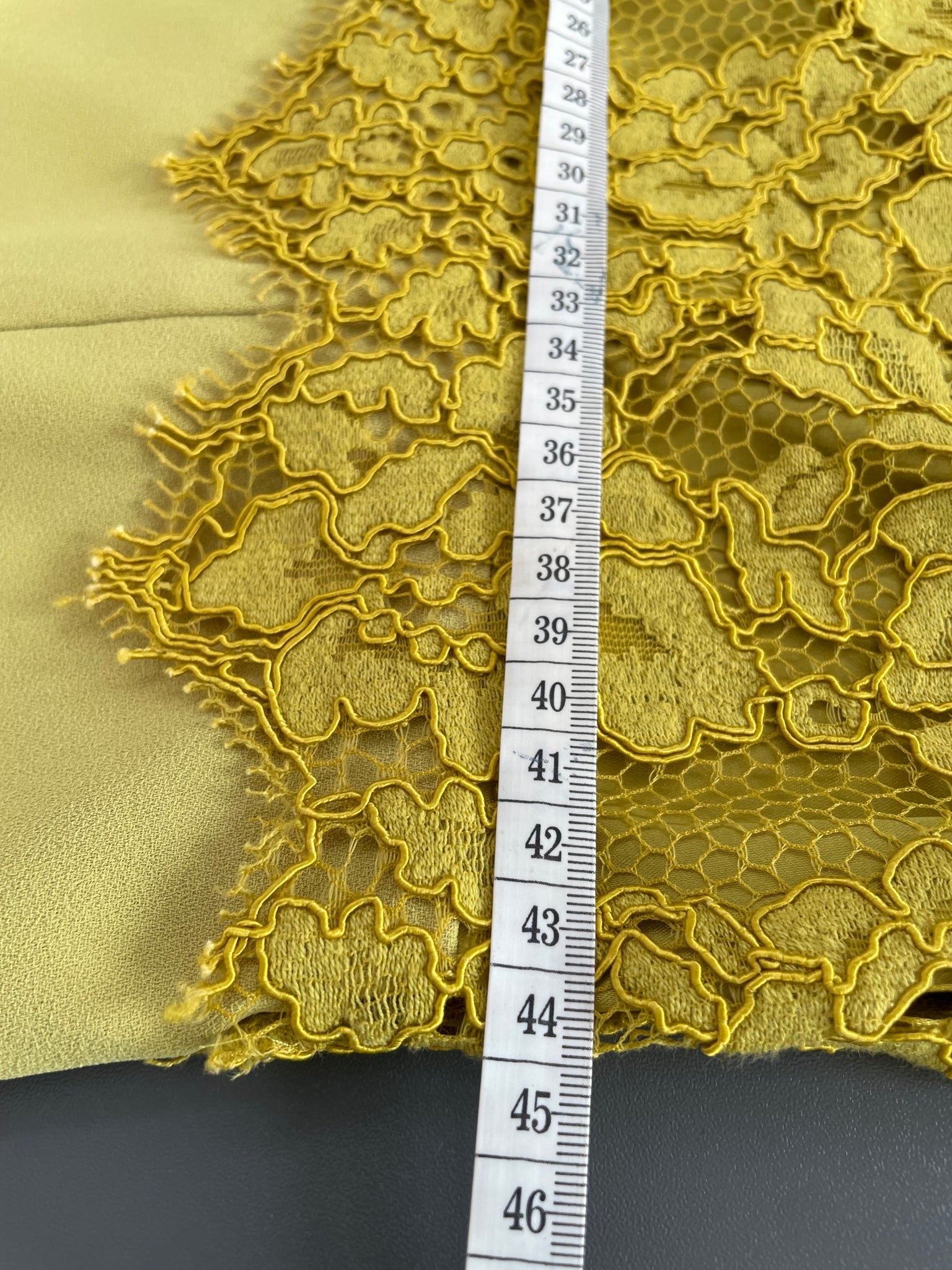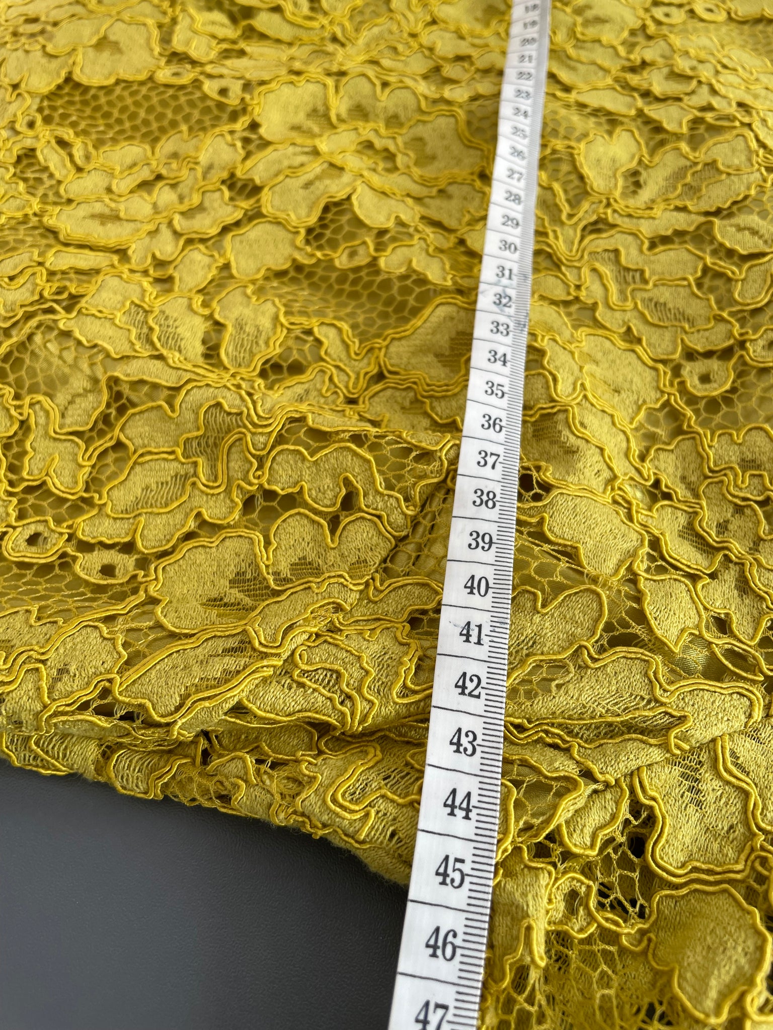 - Chartreuse green/ yellow fabric overlaid with a lace layer