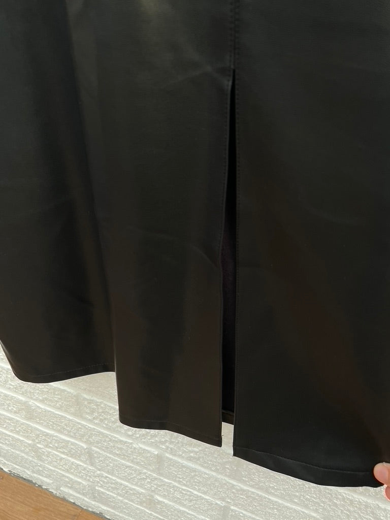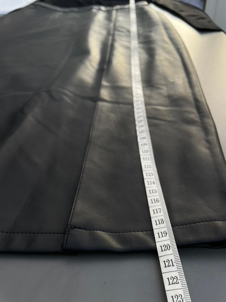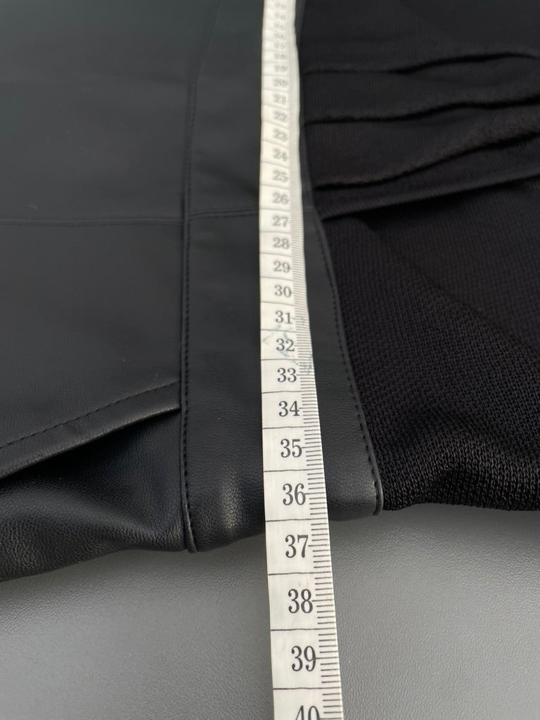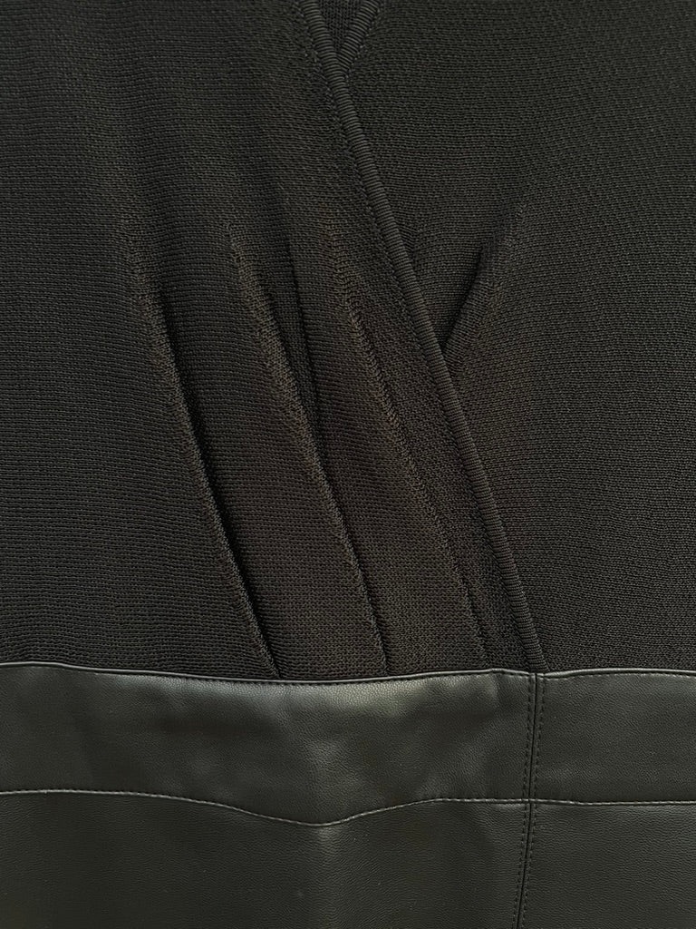 Black semi sheer knit design on the top section and a PU leather fabric to the skirt section