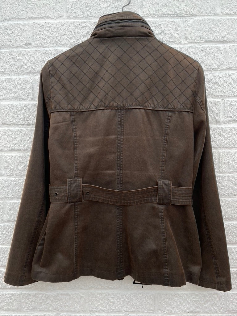 This hip length biker style belted jacket from Laura Ashley is in very good preloved condition and features: