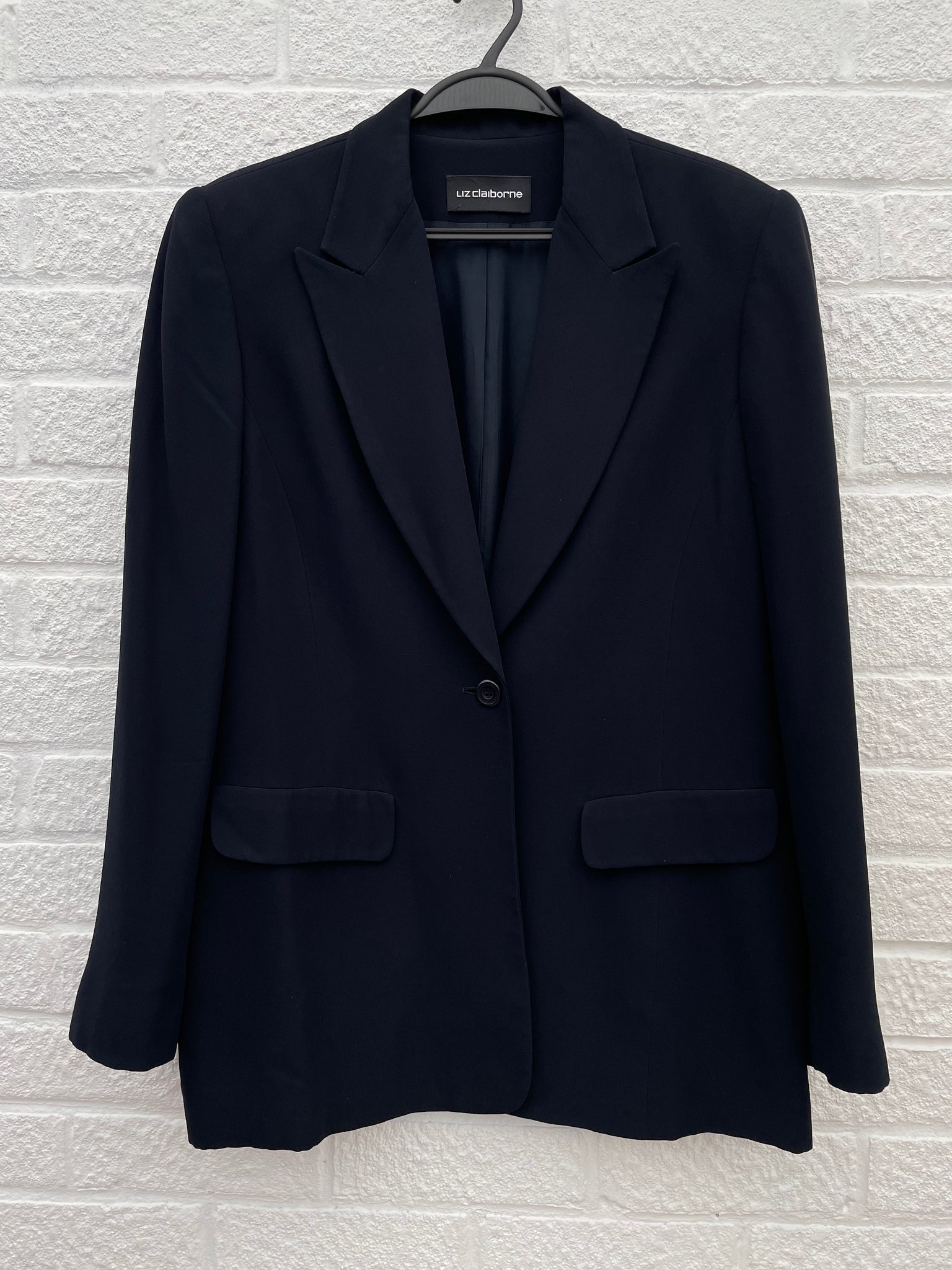 This deep navy blue jacket from Liz Claiborne is in excellent preloved condition and features: