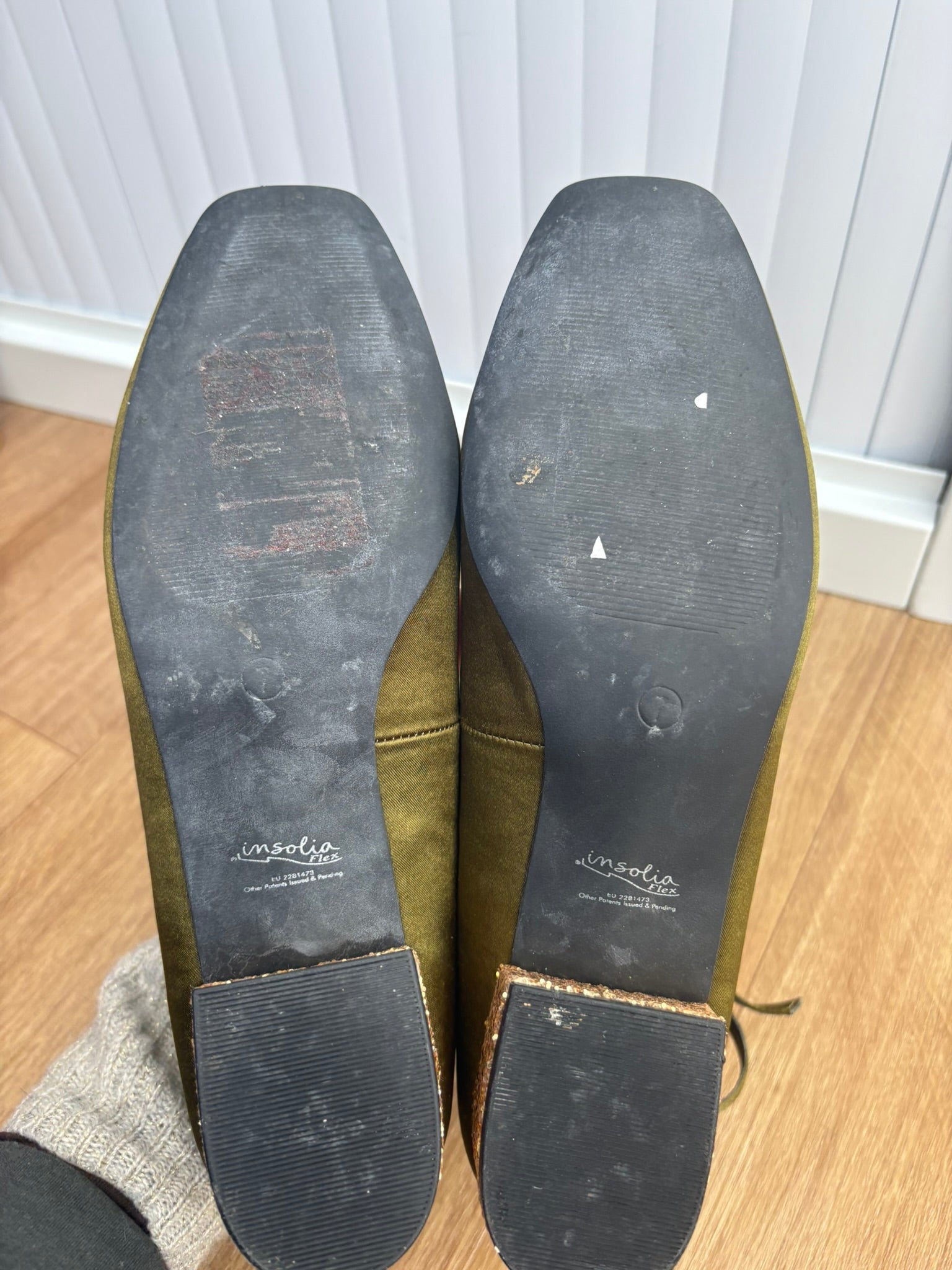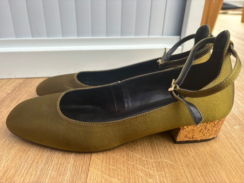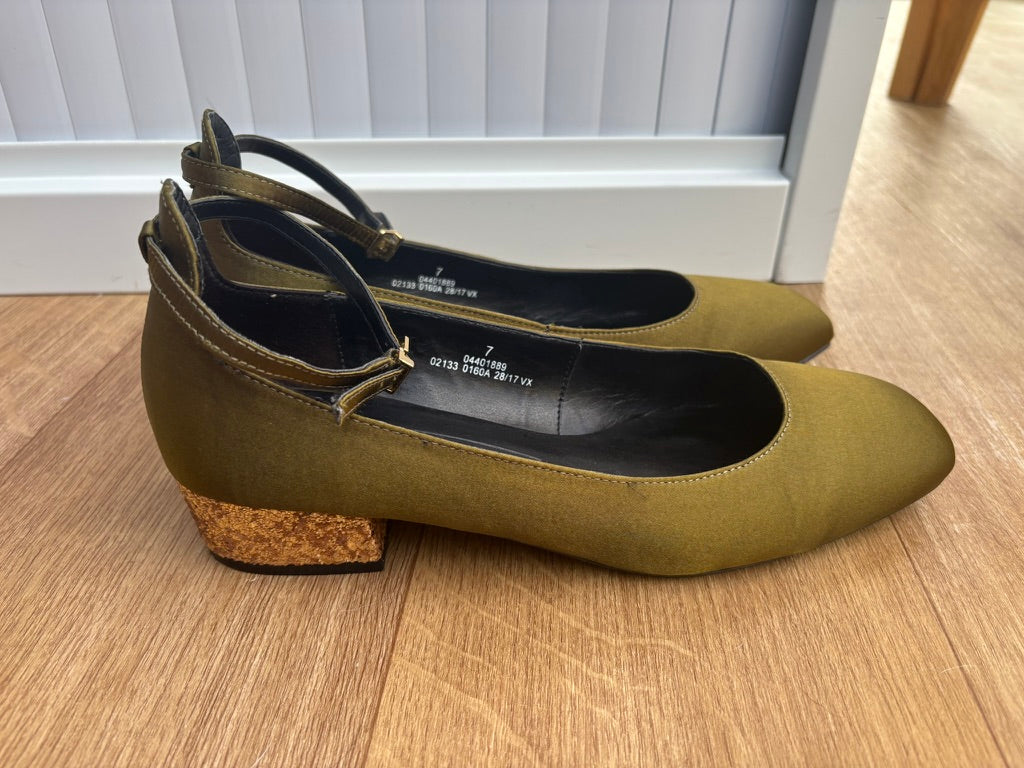 - Deep olive green fabric with gold glittery heels