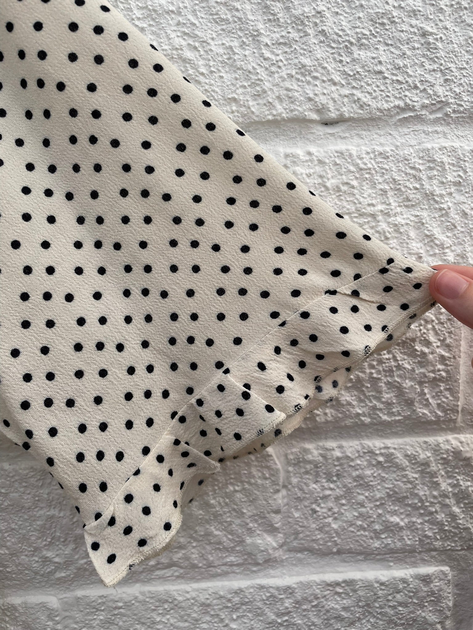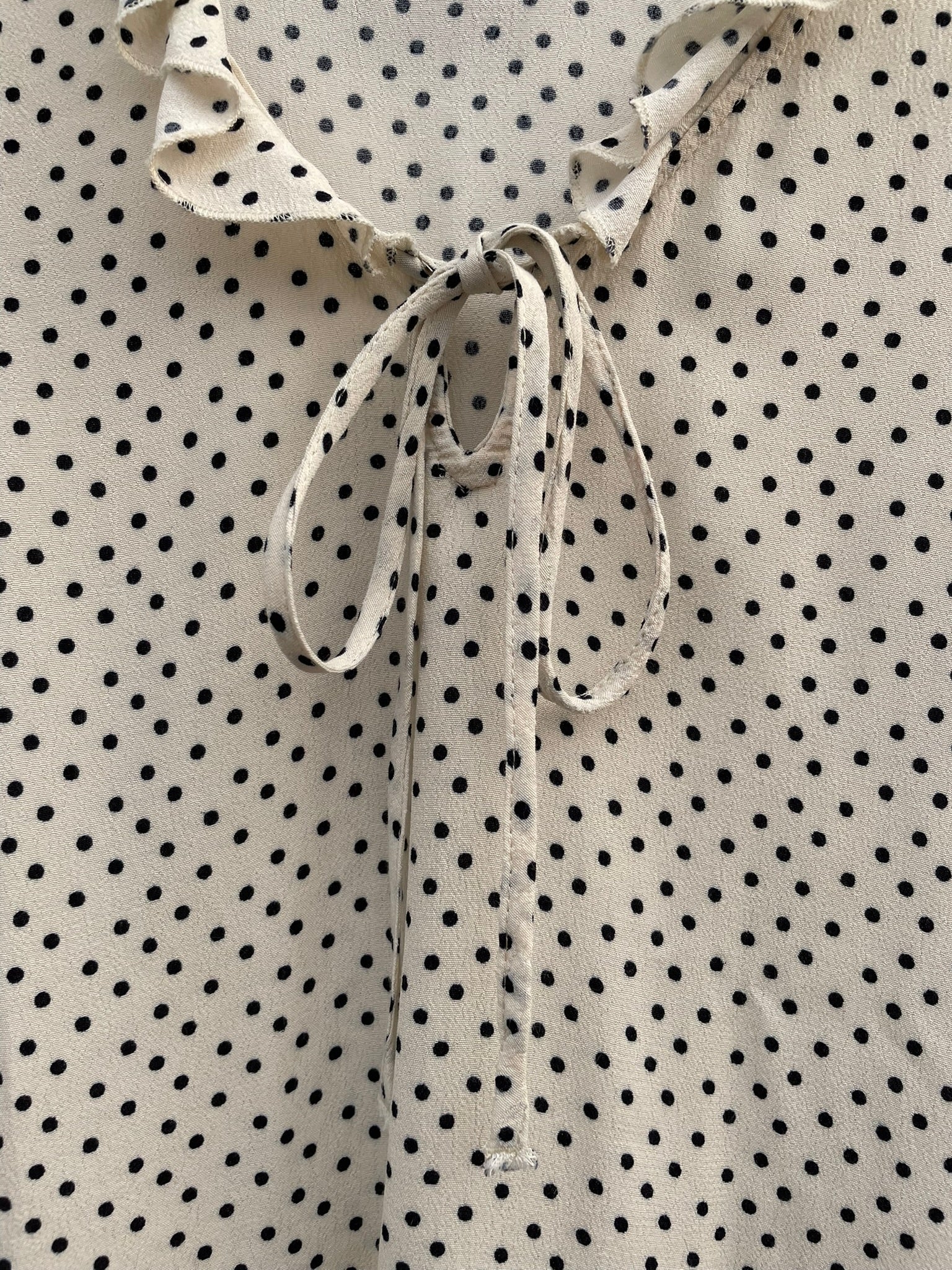 - Frilly V neckline with a tie detail at the front and short sleeves with a frill cuff