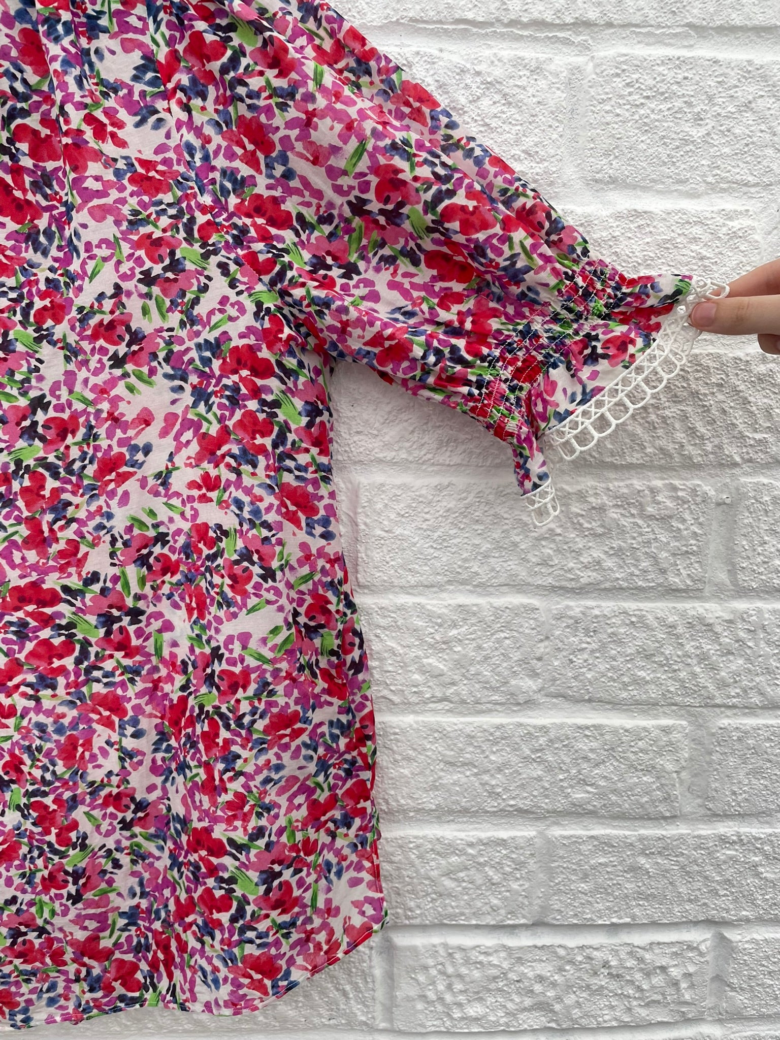 - Red/ pink floral fabric on a white background with white trim