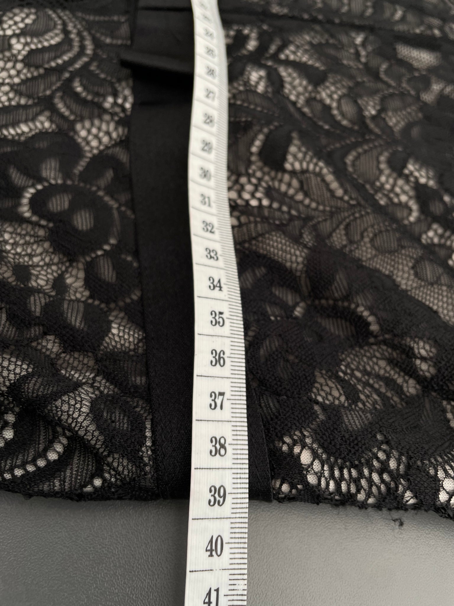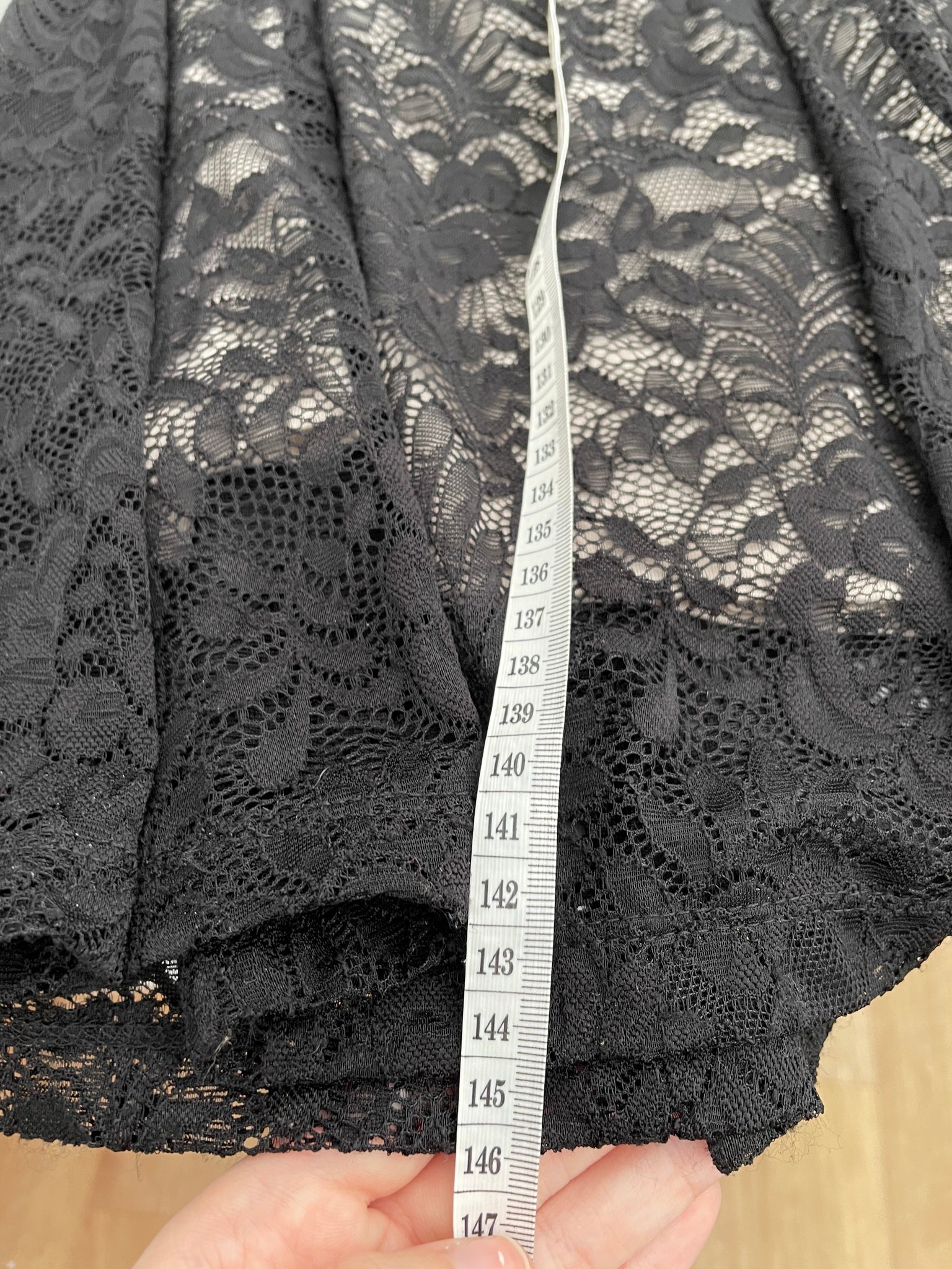 Black lace fabric with a textured floral design all over and a ribbon detail at the waist