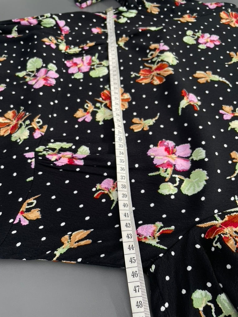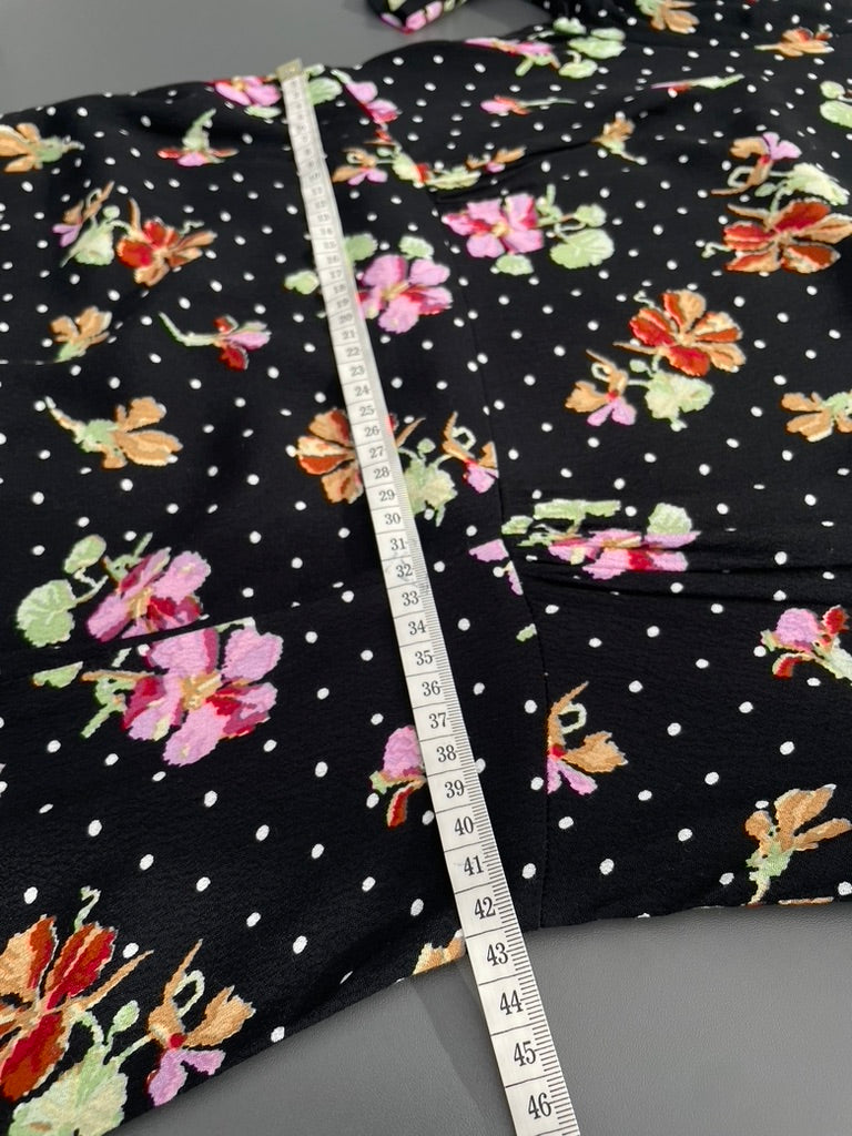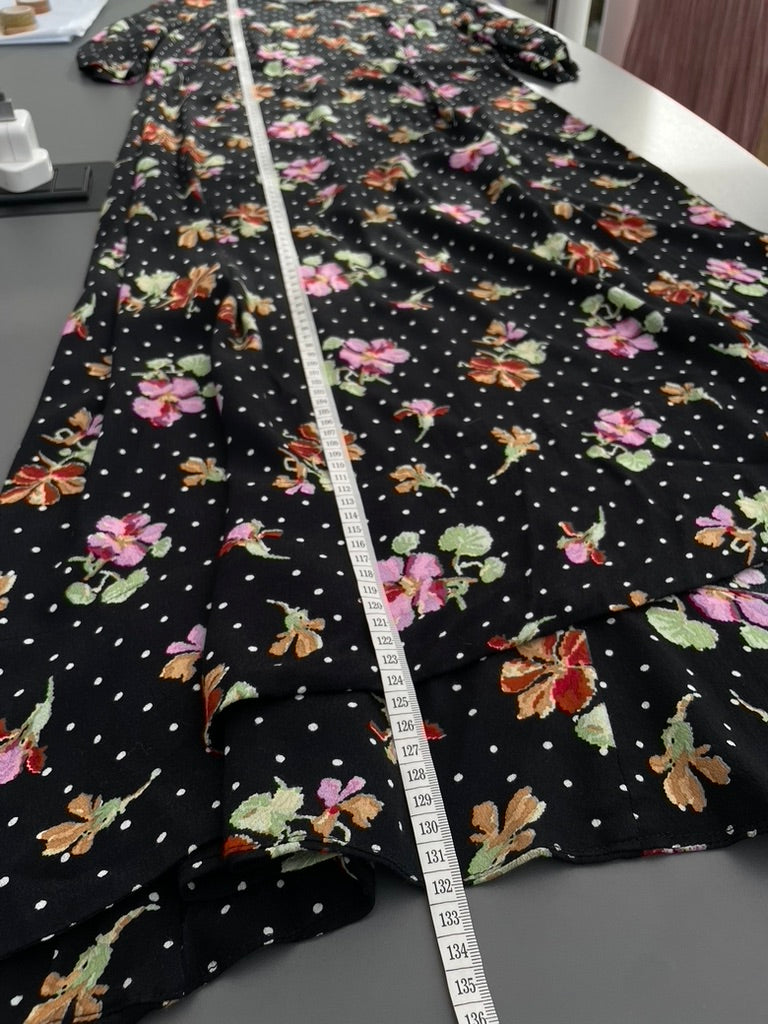 - Black fabric with a spotty and floral print all over in white, pinks and reds/ yellow