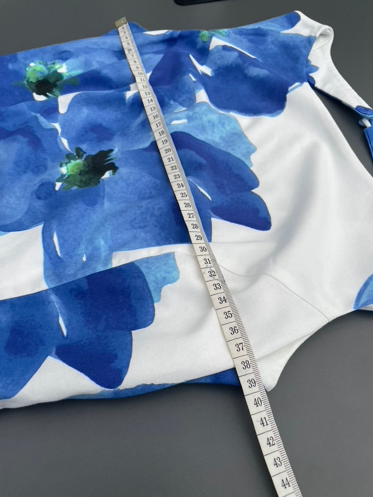 White stretch fabric with a bold blue floral print all over