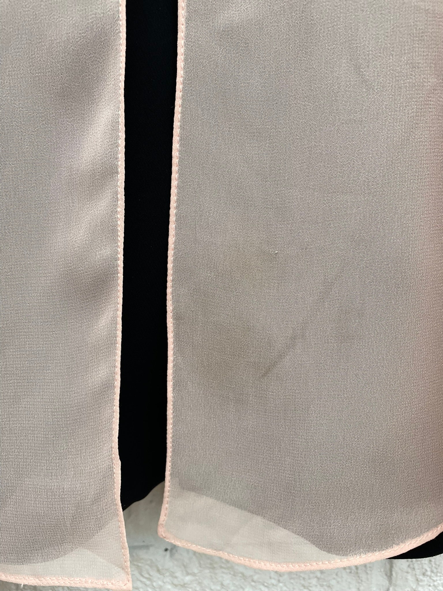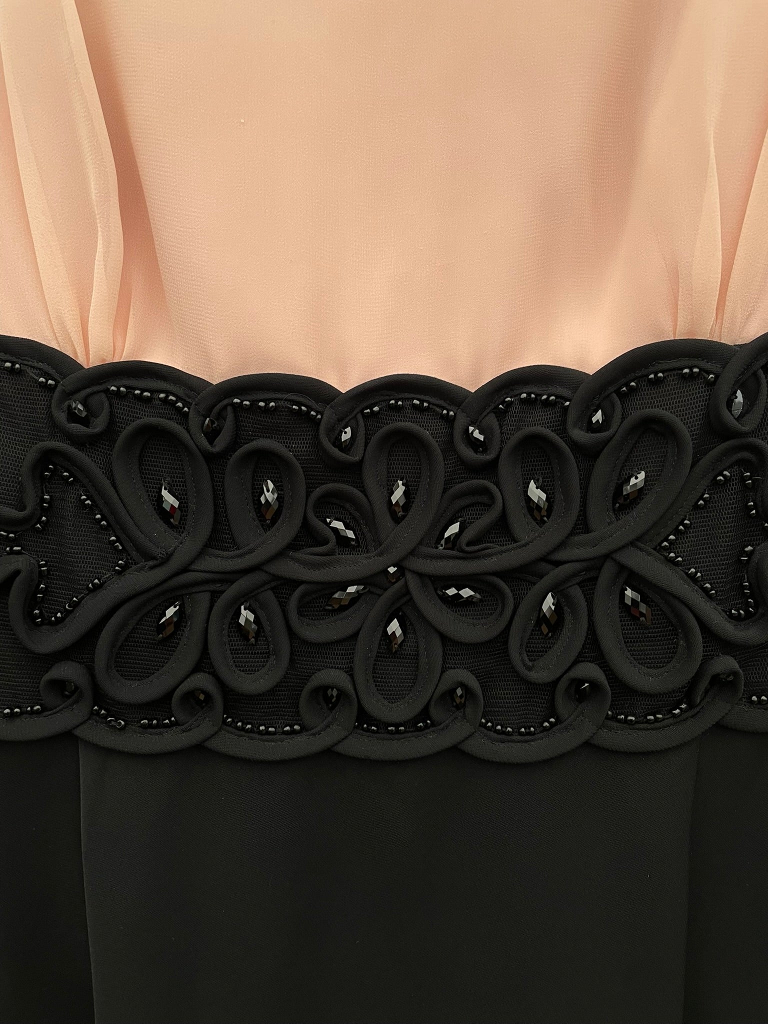 Black fabric skirt with a decorative beaded waistband and light pink floaty style top