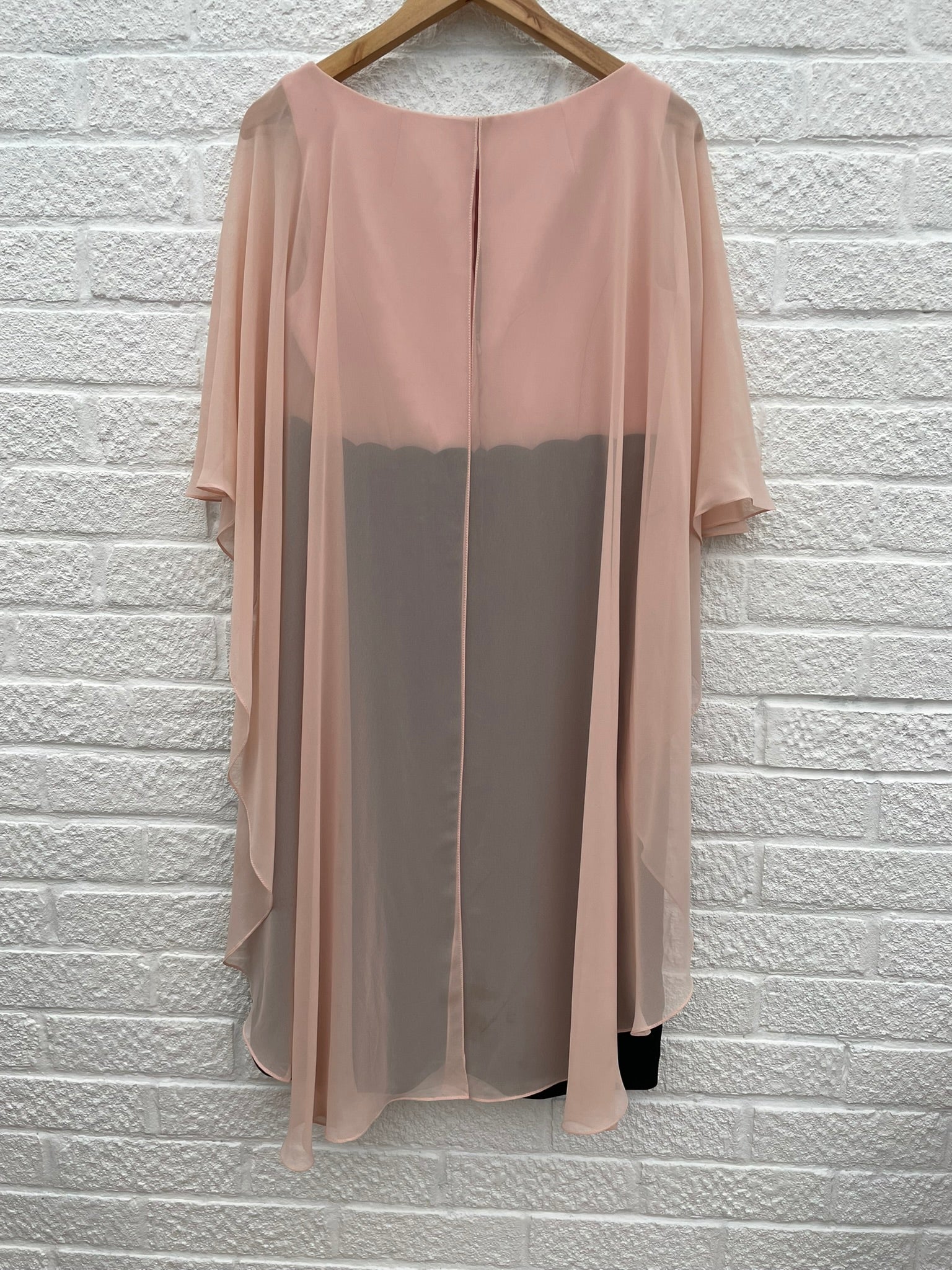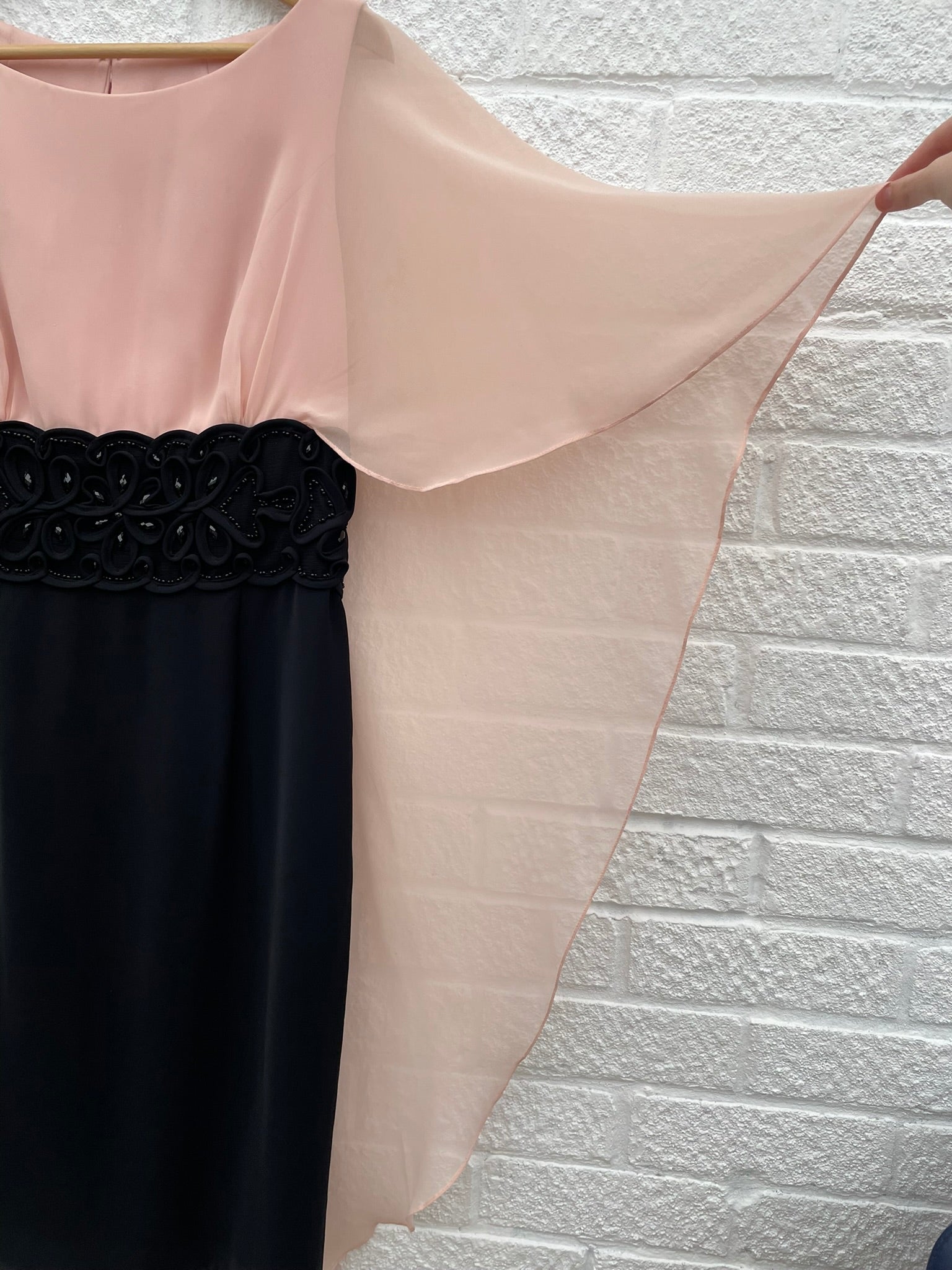 - Straight, slightly fitted shape dress with a loose fit drapey layer over the top section that drapes down the back of the dress and covers the tops of the arms
