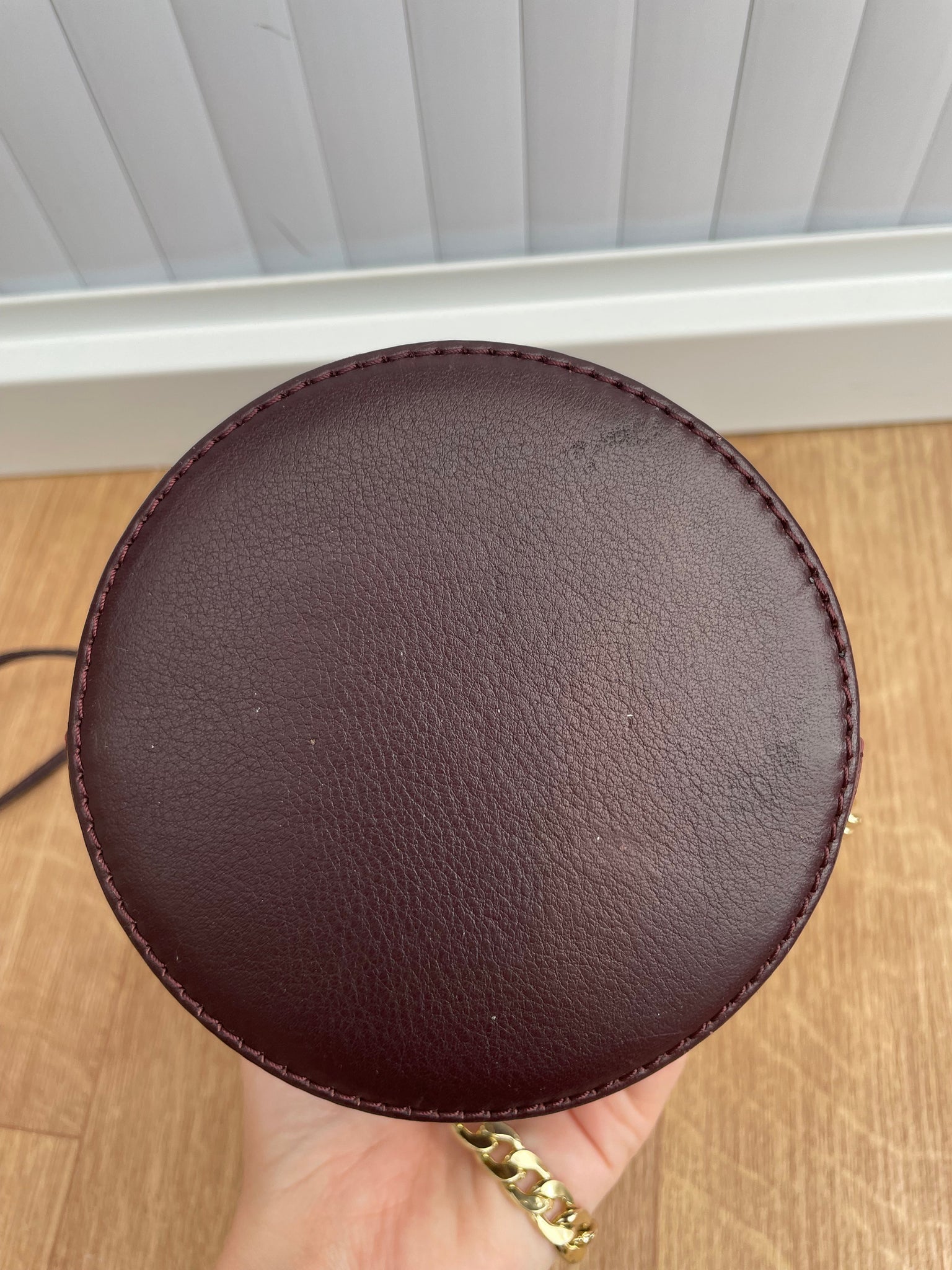- Round shaped rigid bag with a deep pink velvet top secured by a drawstring fastening
