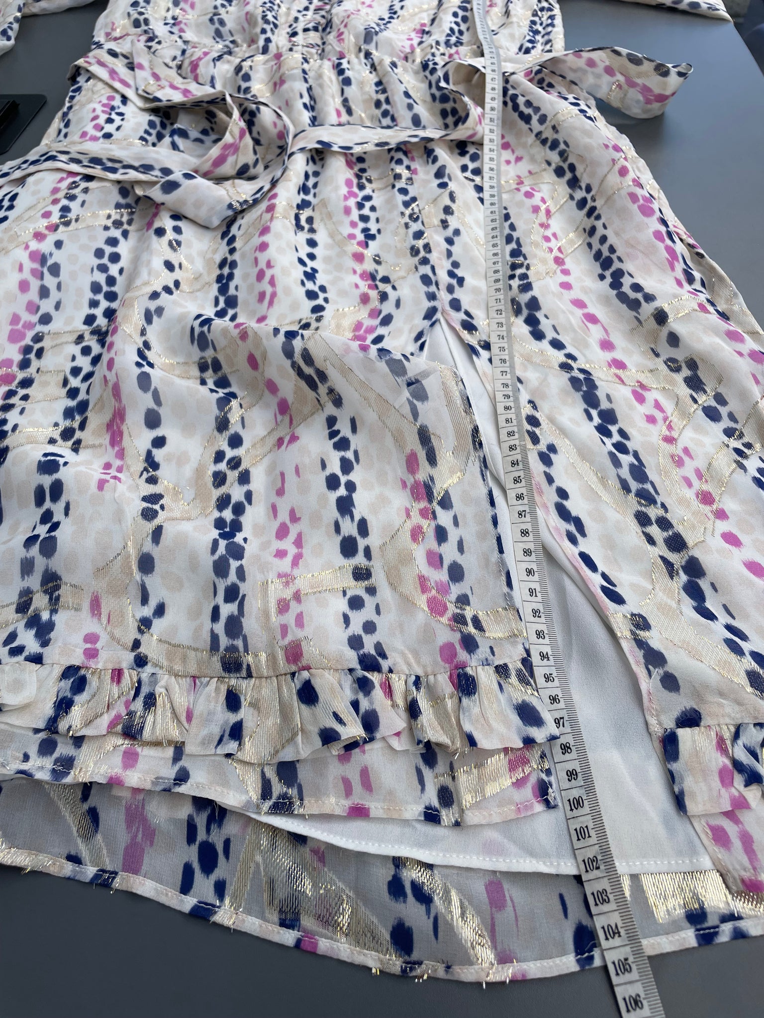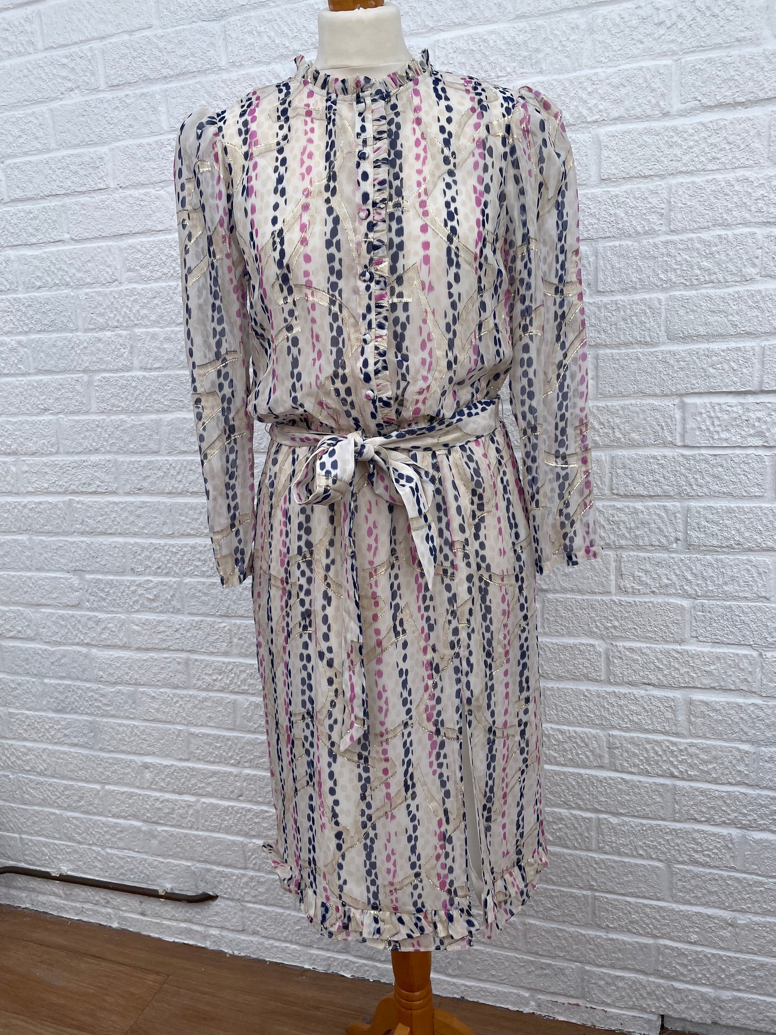- Cream sheer fabric with a pink and blue print and a metallic gold thread running through it