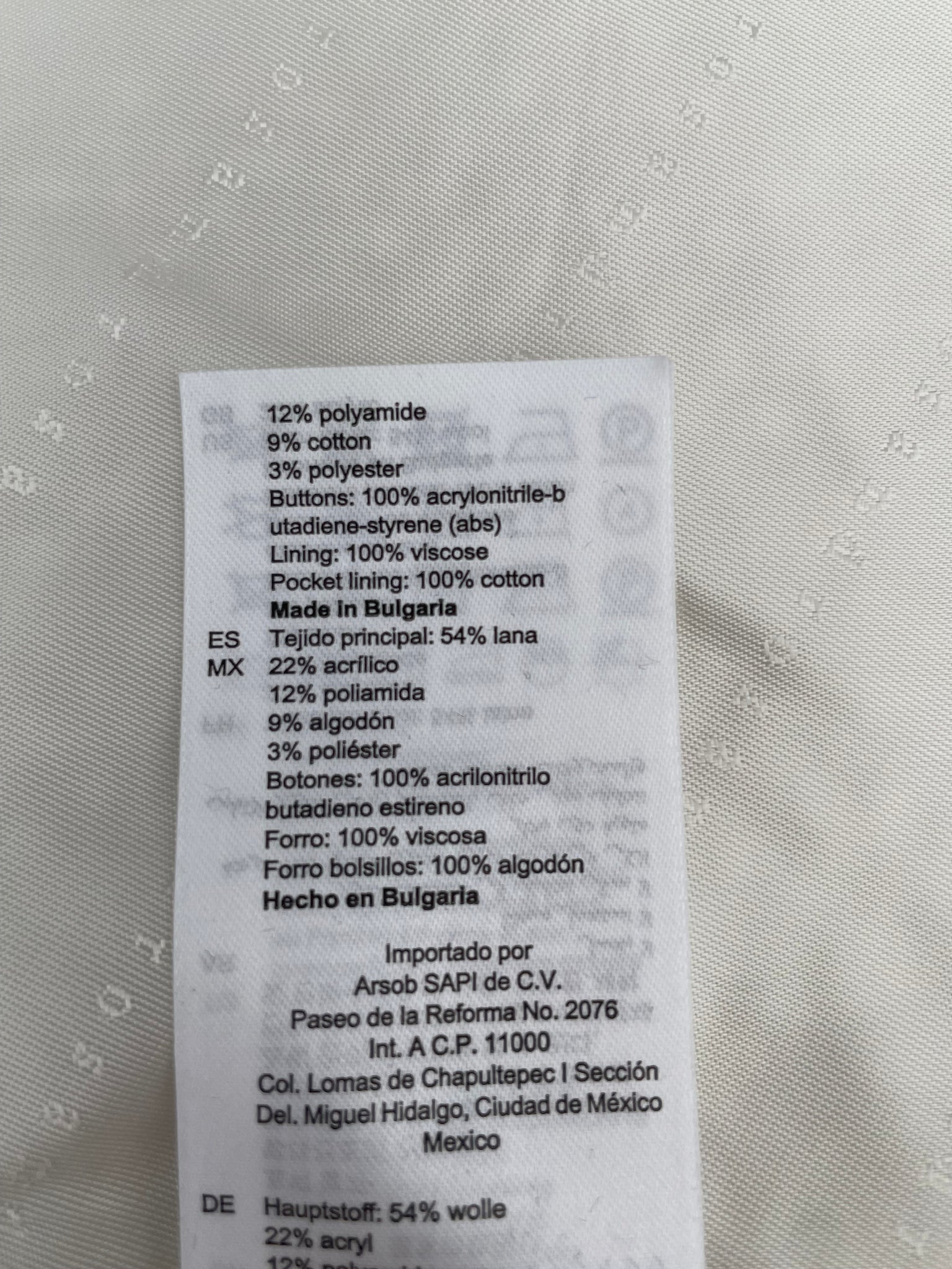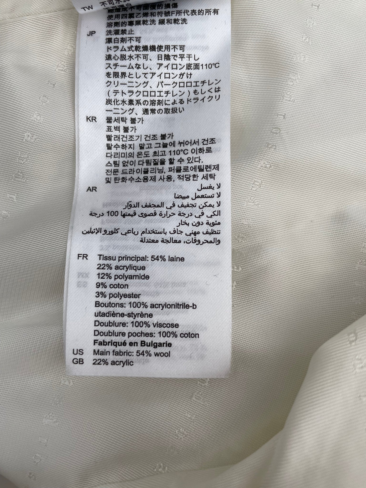 - 54% wool/ 22% acrylic/ 12% polyamide/ 9% cotton/ 3% polyester mix fabric