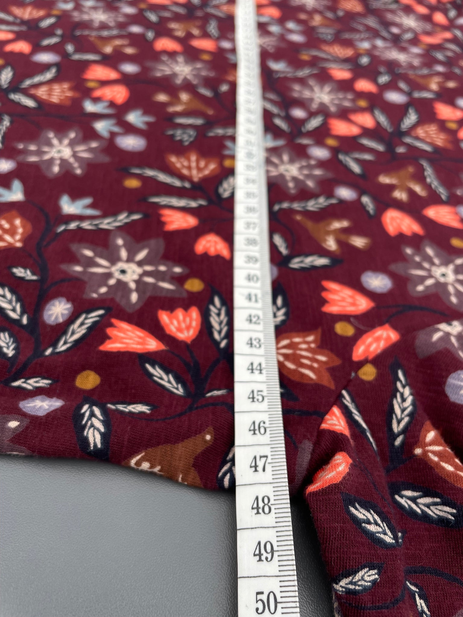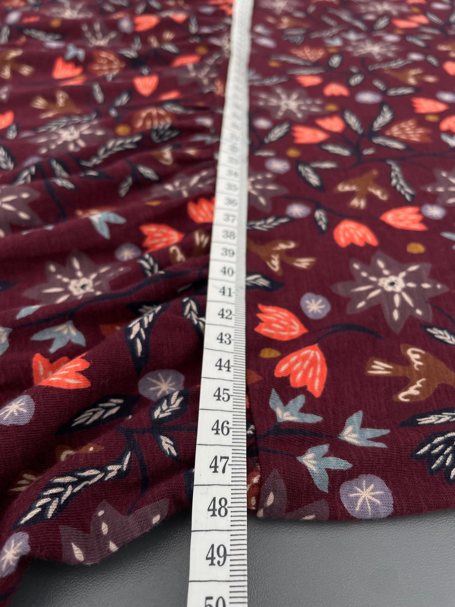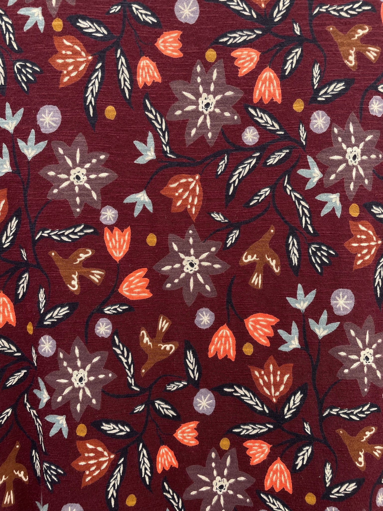 - Mahogany coloured background with an autumnal coloured leaf, flower and bird print
