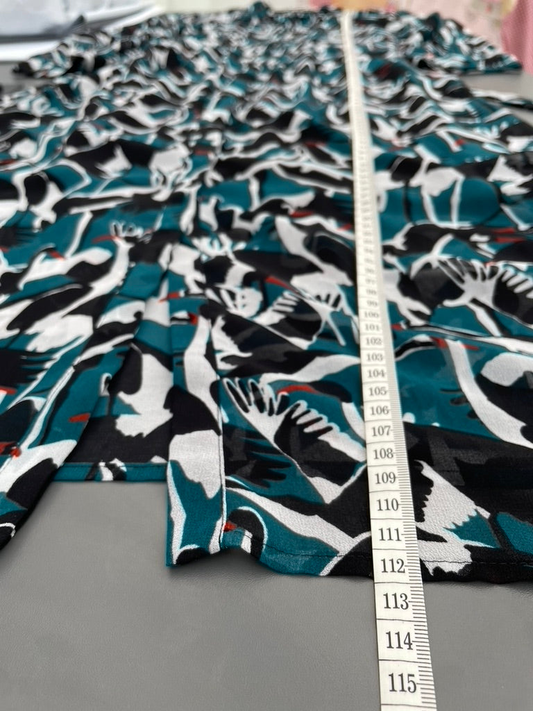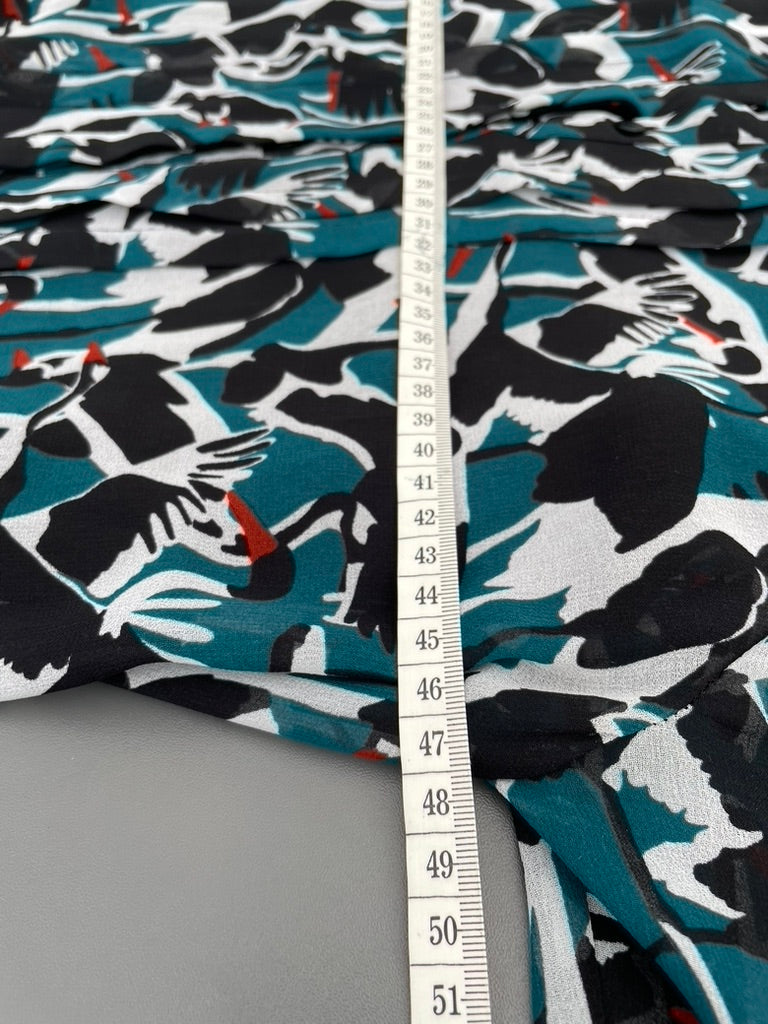 - Black, green and ivory sheer fabric in a medium sized print