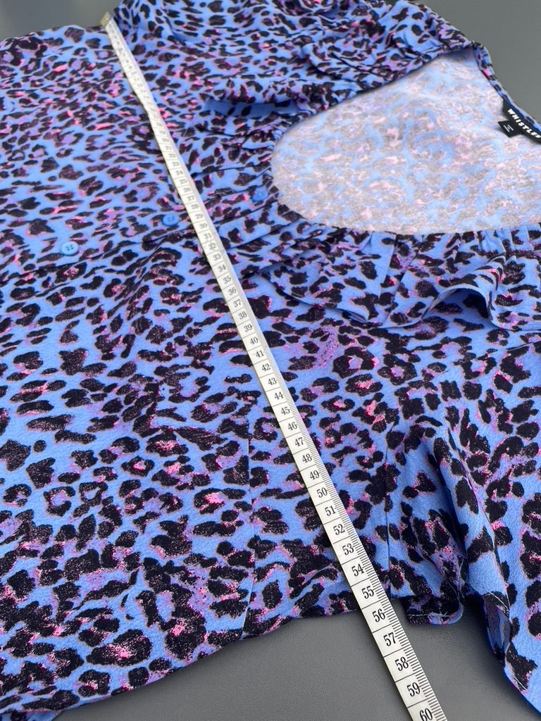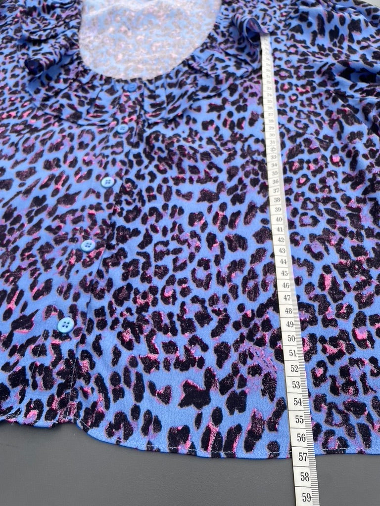 - Frilly scoop neckline with buttons up the front and short loose fitting sleeves