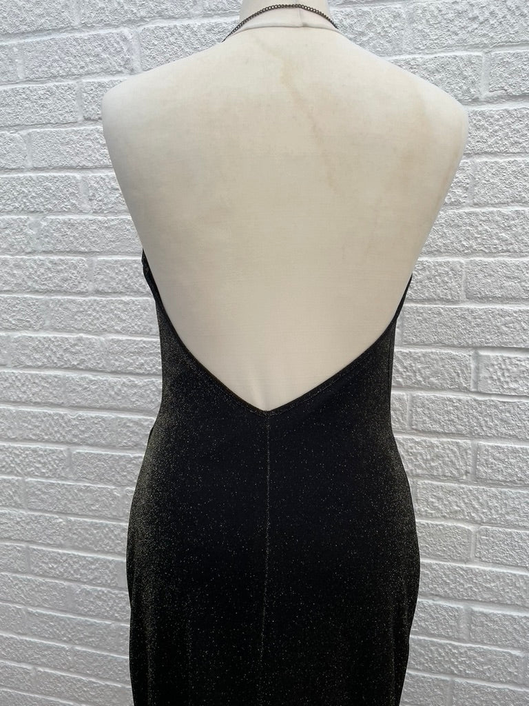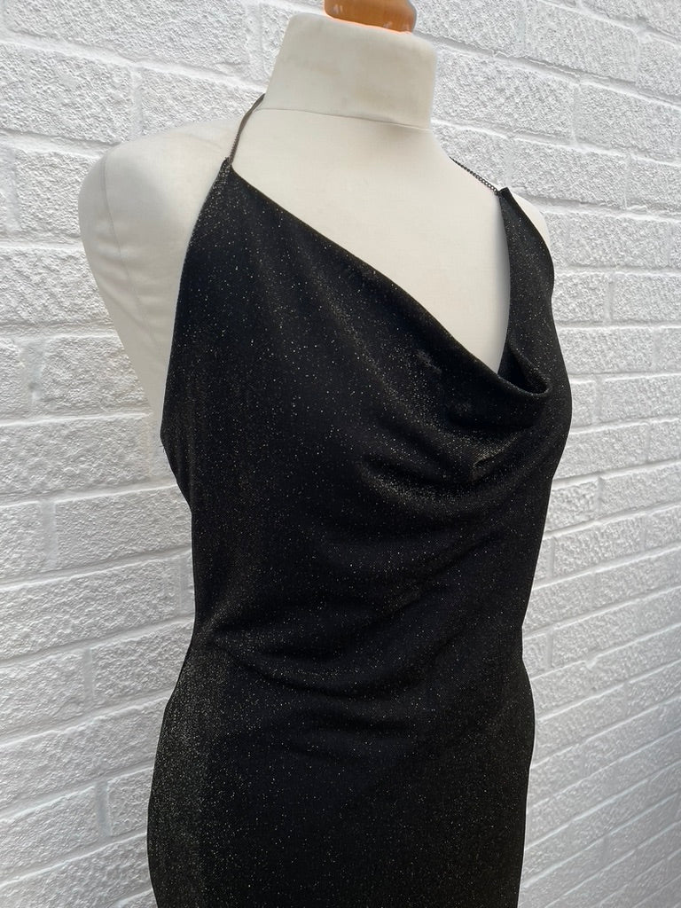 - Cowl neckline and sleeveless with a chain halterneck strap