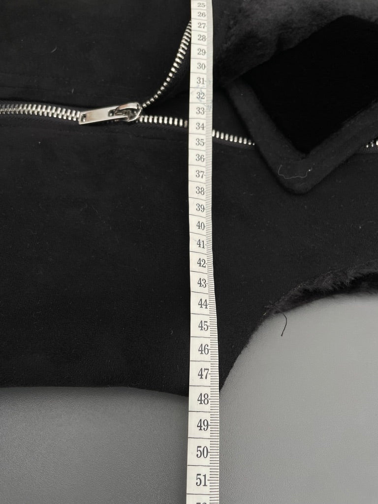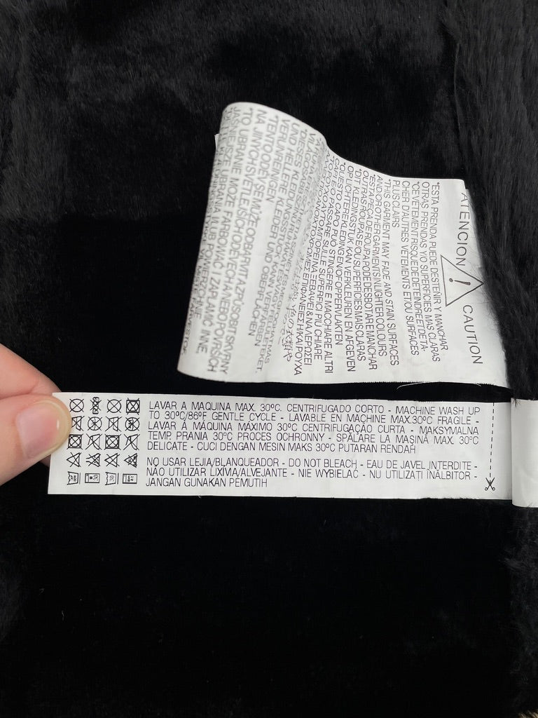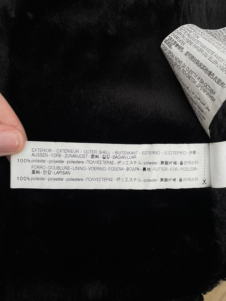 Black faux sheepskin fabric with a black faux fur fabric on the reverse