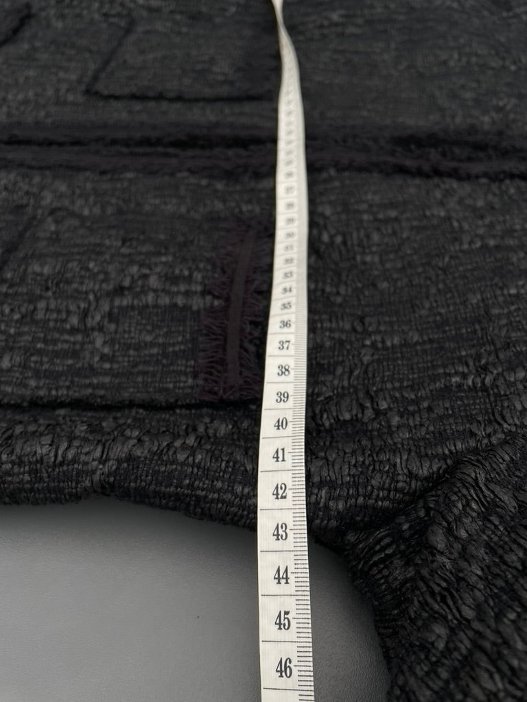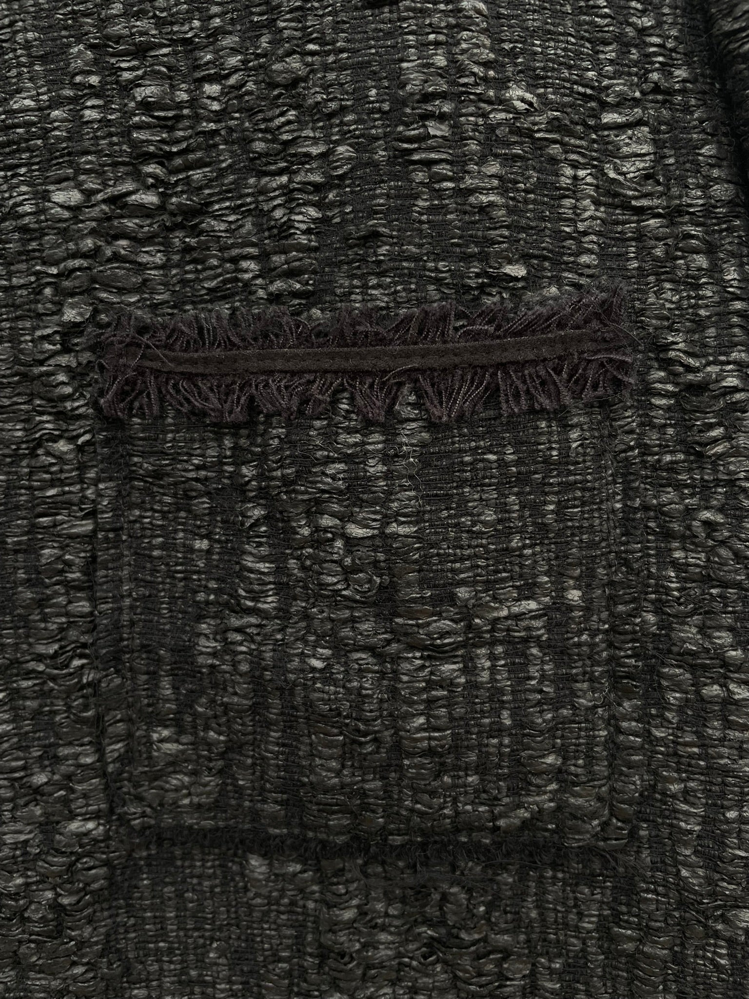 - Black chunky woven textured fabric with a slight sheen